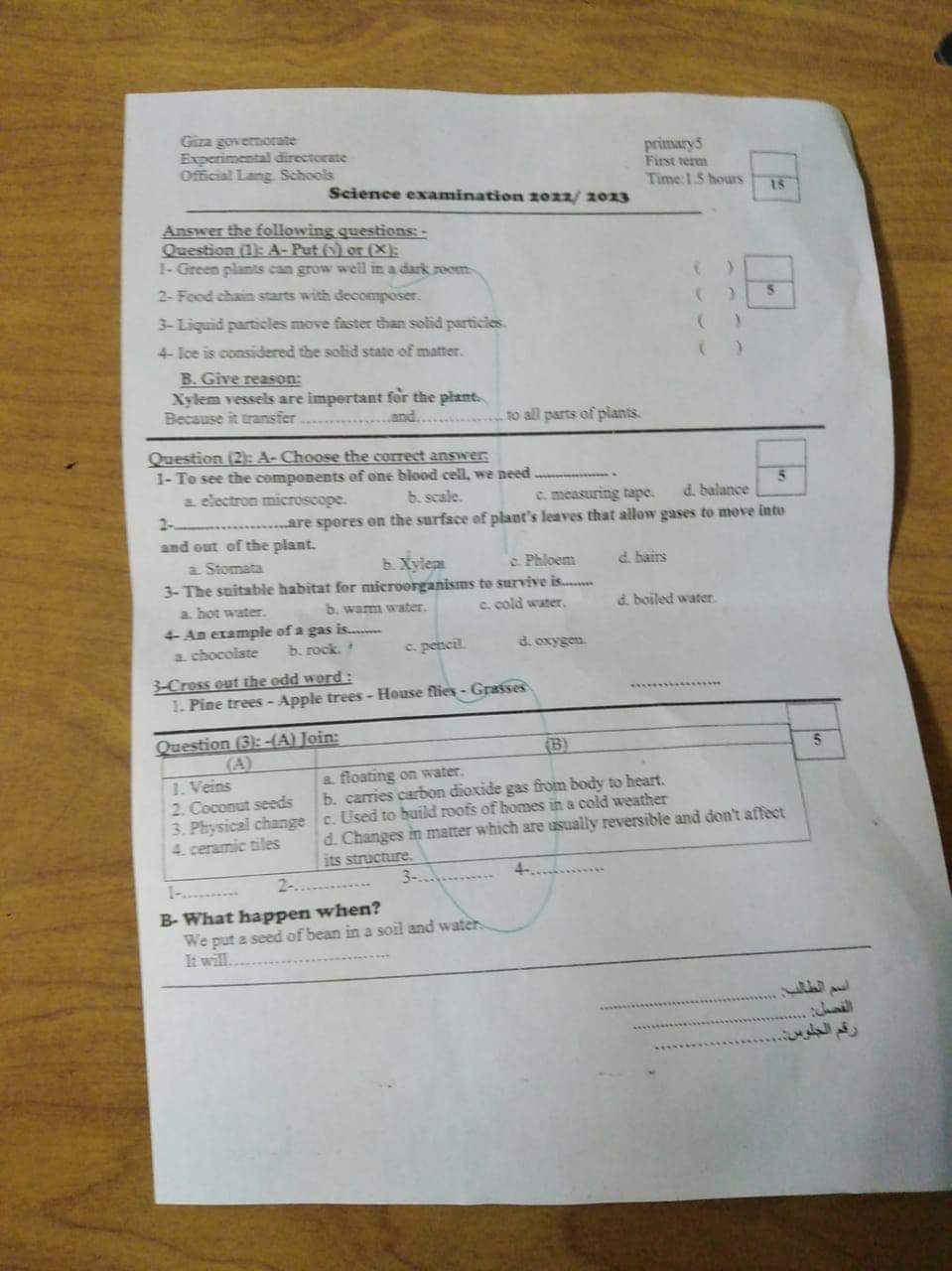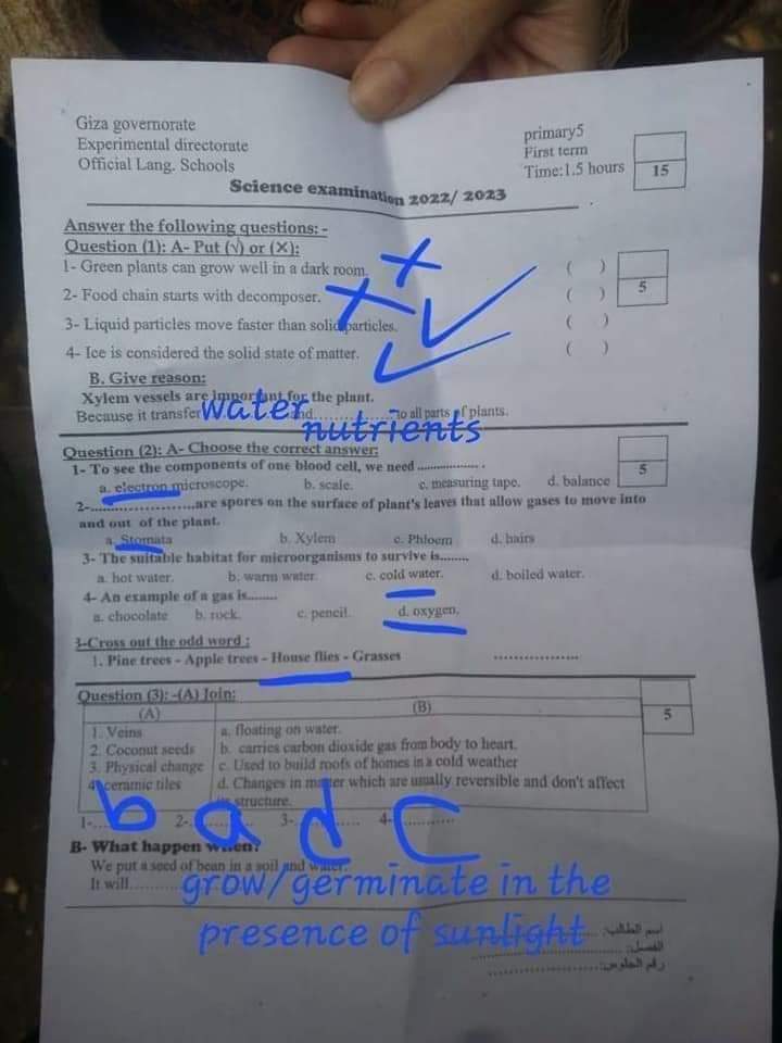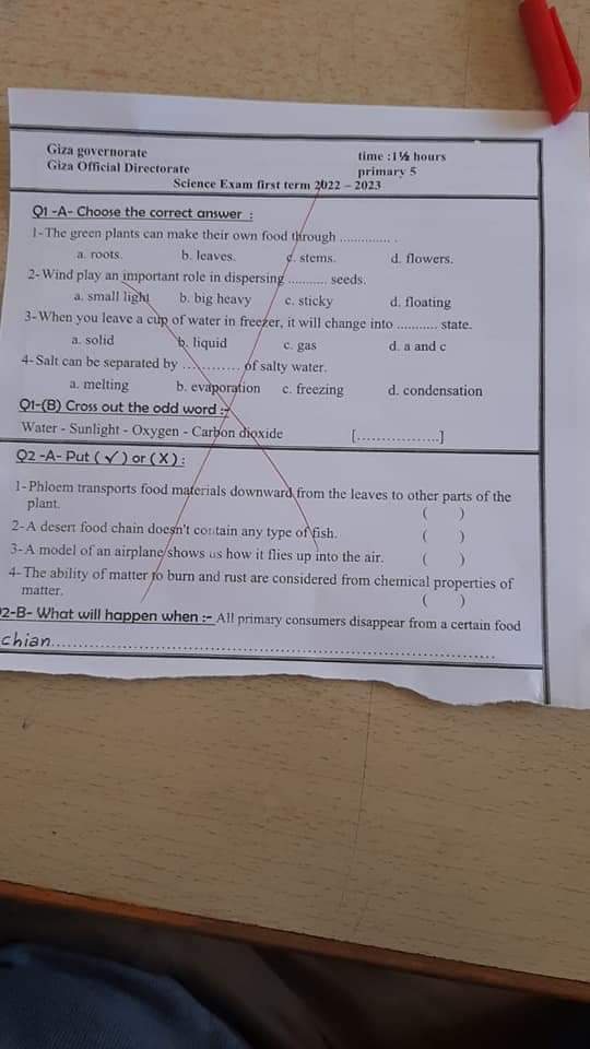 امتحان العلوم والساينس محافظة الجيزة الصف الرابع والخامس الابتدائي الترم الاول 2023