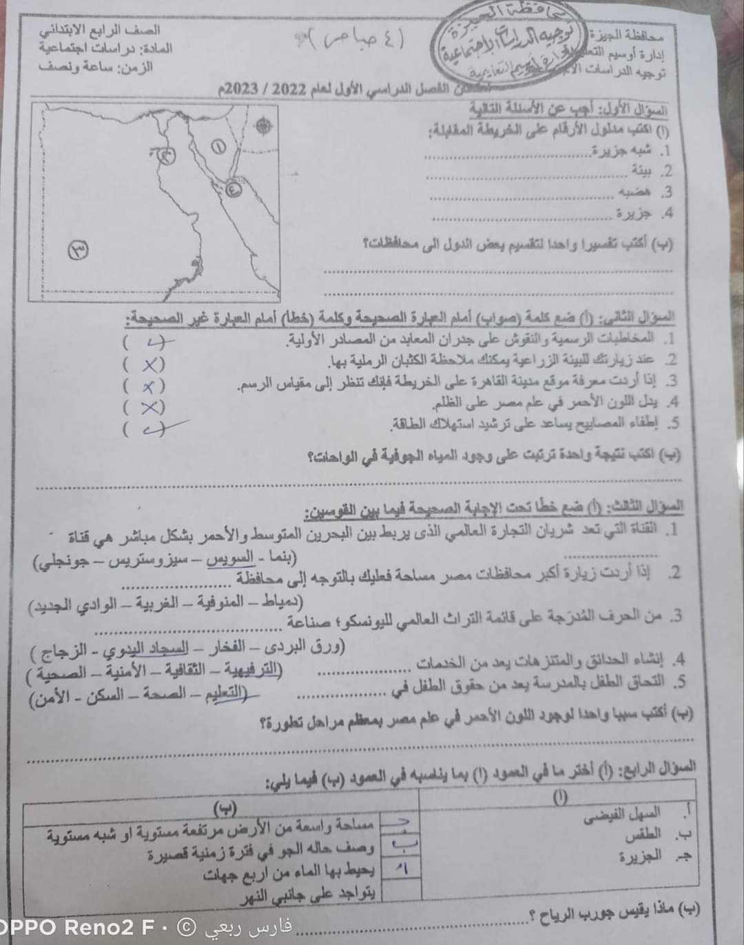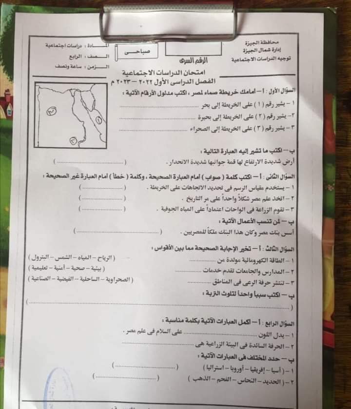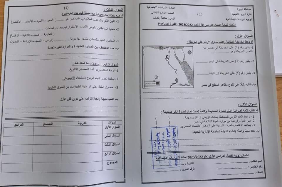 امتحان الدراسات الاجتماعية محافظة الجيزة الصف الرابع والخامس الابتدائي الترم الاول 2023