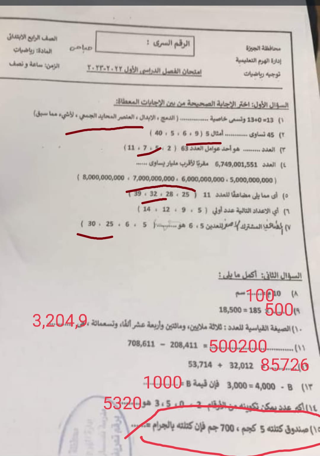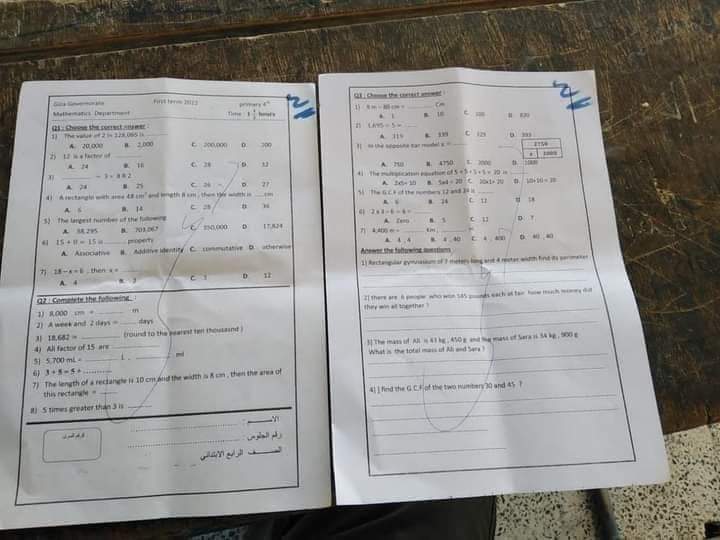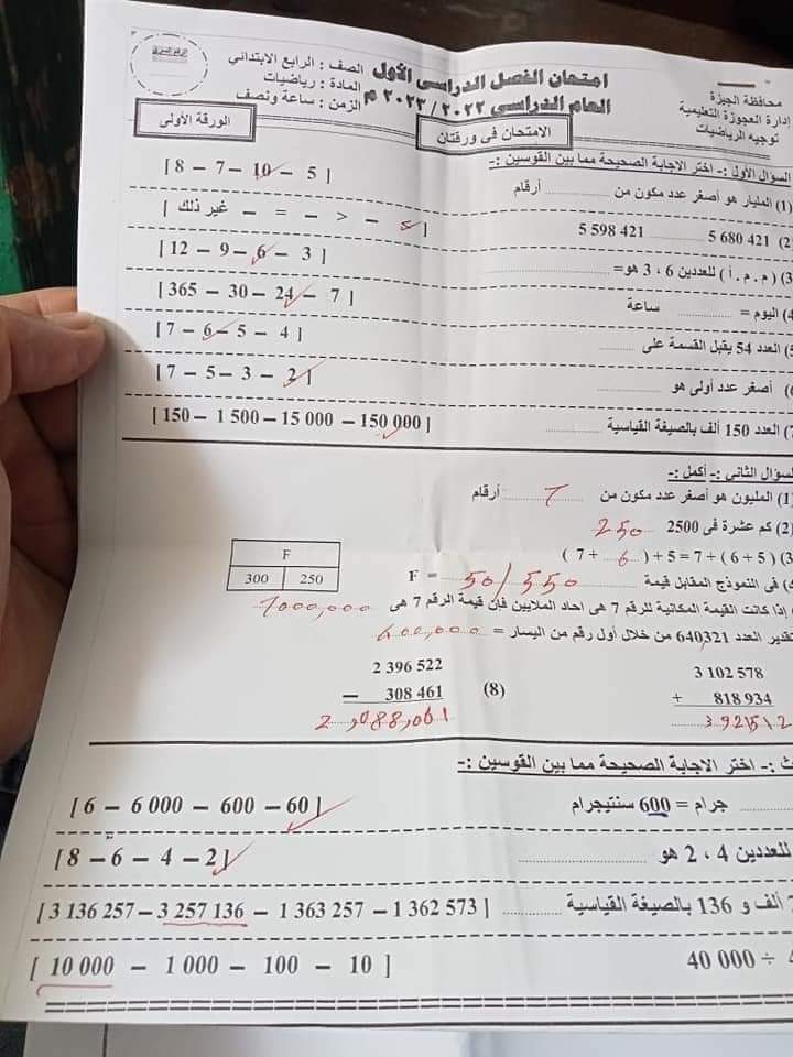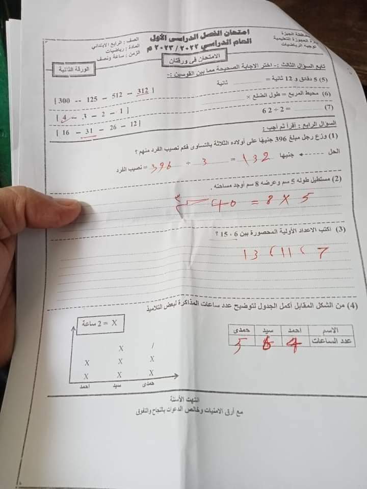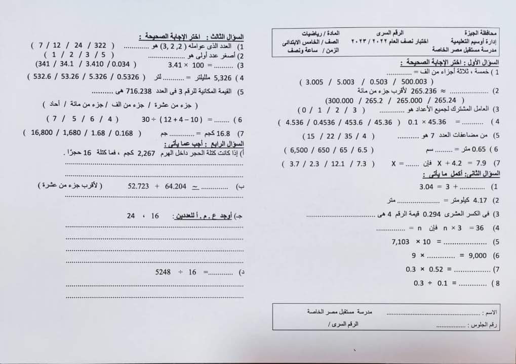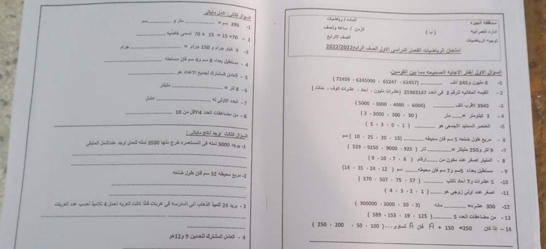 امتحان الرياضيات محافظة الجيزة الصف الرابع والخامس الابتدائي الترم الاول 2023