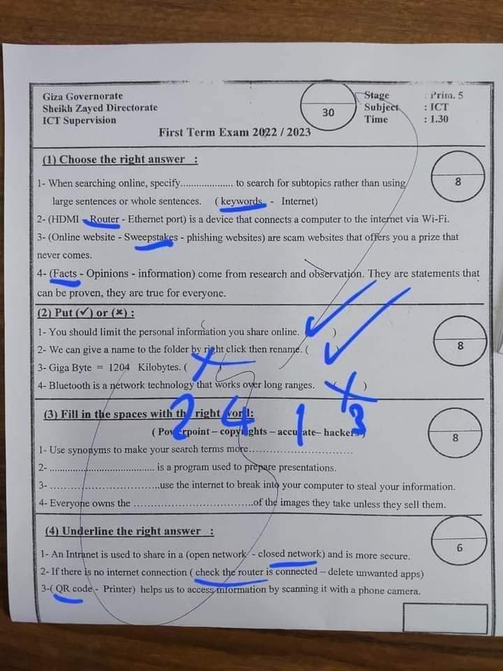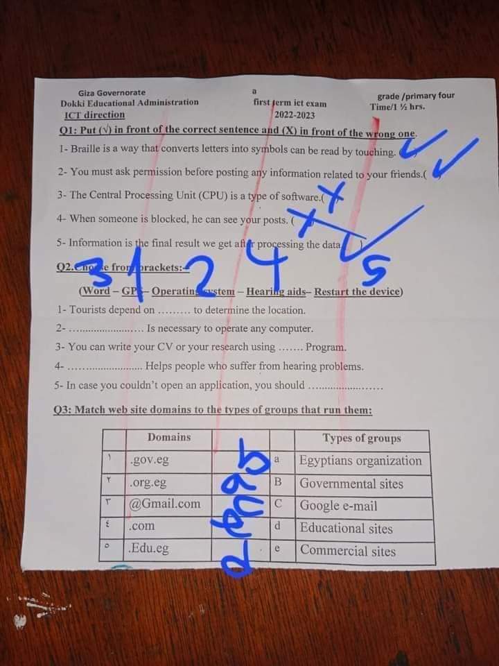 امتحانات تكنولوجيا المعلومات والاتصالات ICT محافظة الجيزة الصف الرابع والخامس الابتدائي الترم الاول 2023
