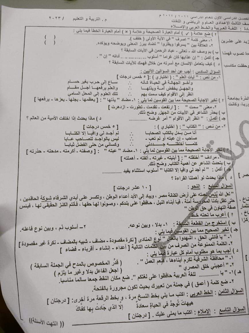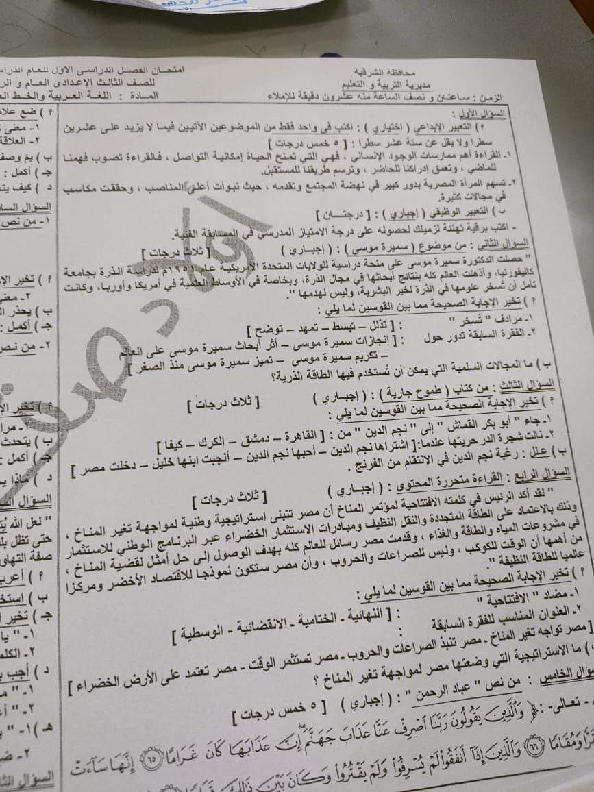 تحميل امتحان اللغة العربية محافظة الشرقية الصف الثالث الاعدادي الترم الاول 2023