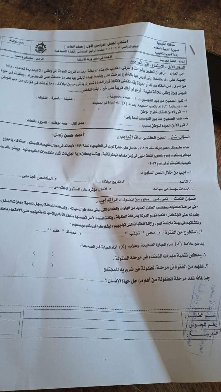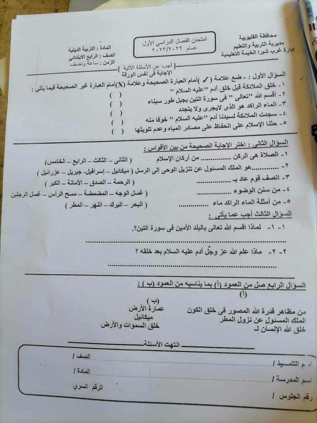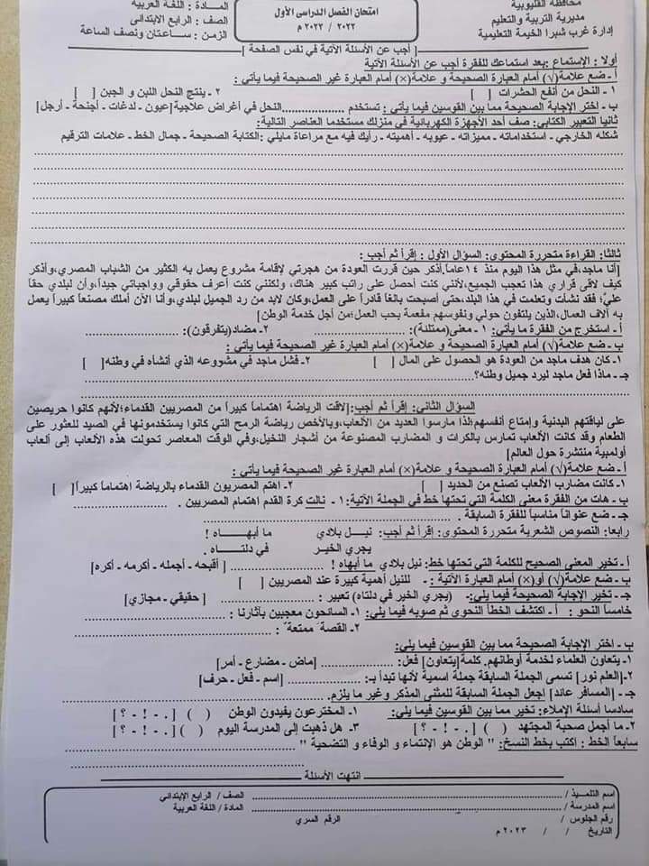 تجميع امتحانات اللغة العربية والتربية الدينية الاسلامية محافظة القليوبية للصفين الرابع والخامس الابتدائي الترم الاول 2023