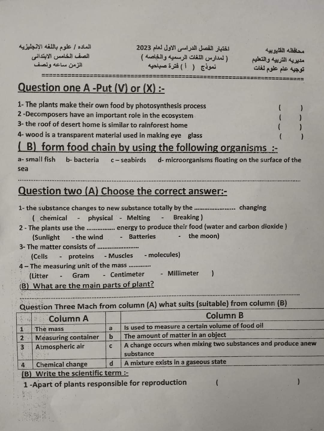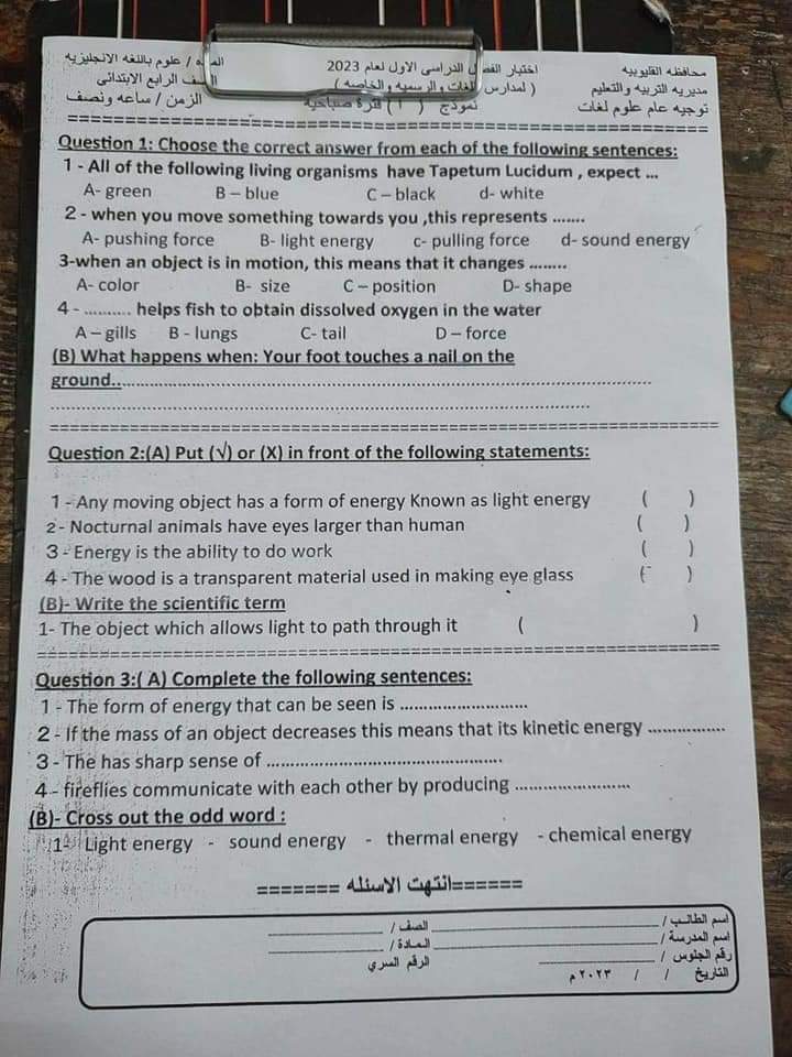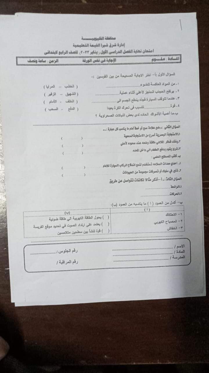 تجميع امتحانات العلوم والساينس محافظة القليوبية للصفين الرابع والخامس الابتدائي الترم الاول 2023