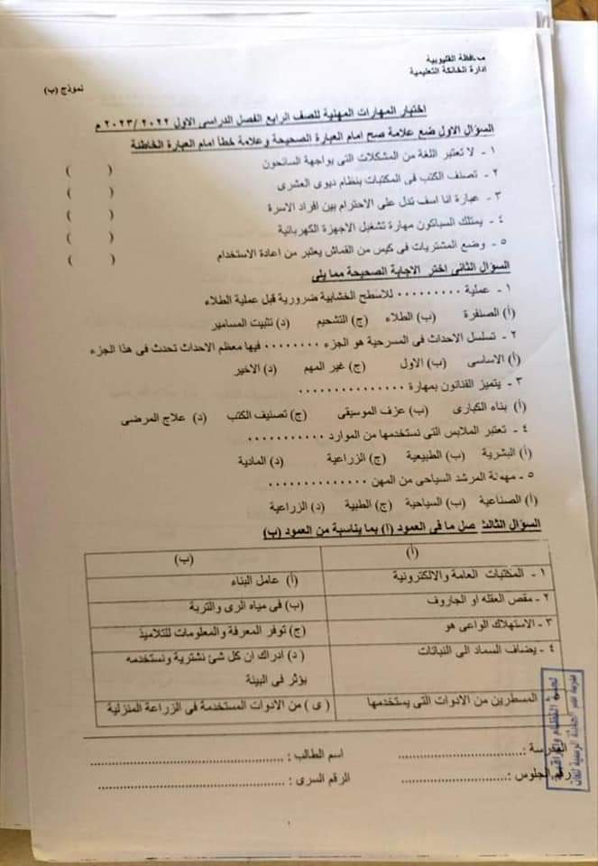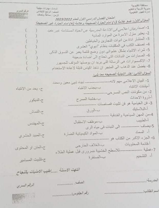 تجميع امتحانات المهارات المهنية محافظة القليوبية للصفين الرابع والخامس الابتدائي الترم الاول 2023