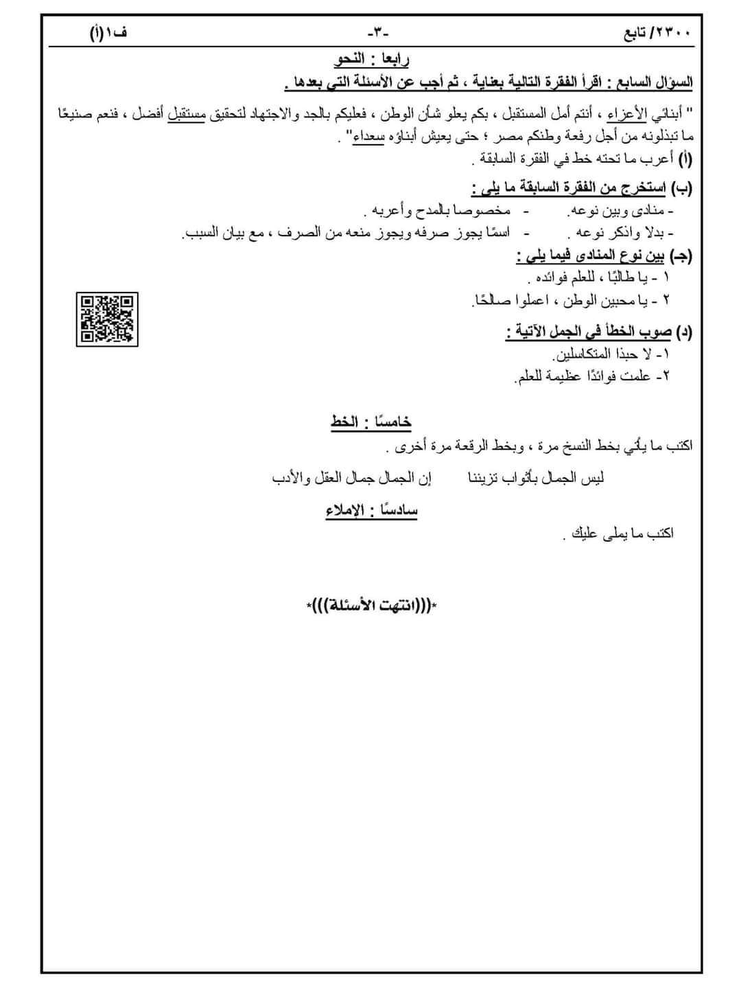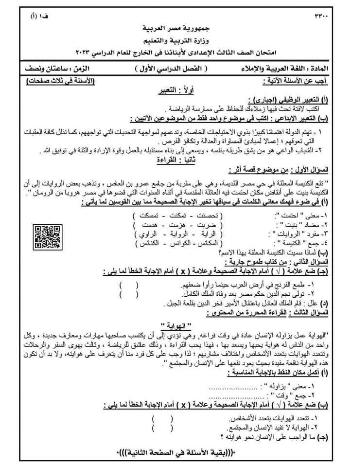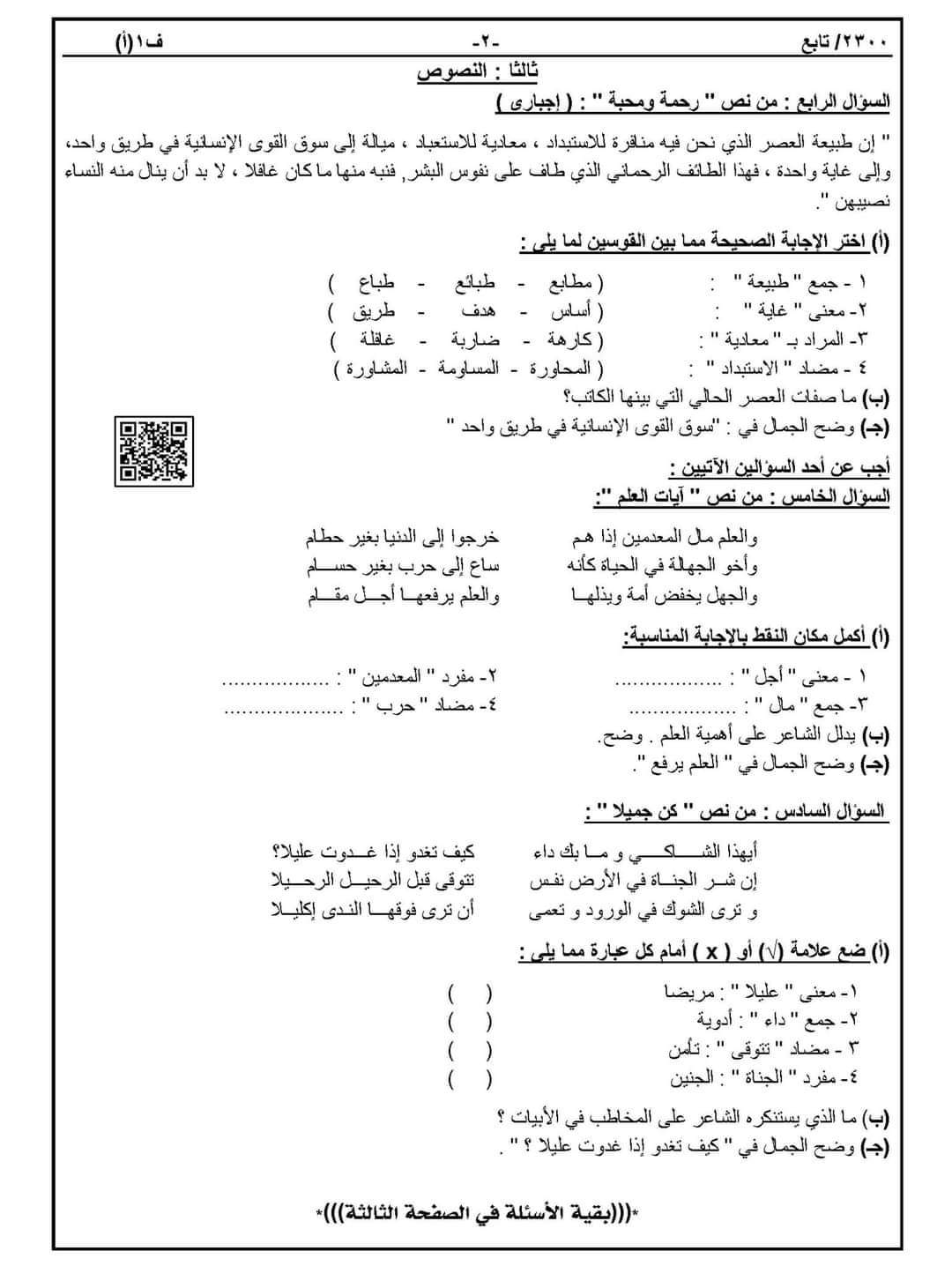تحميل امتحان اللغة العربية ابنائنا في الخارج الصف الثالث الاعدادي الترم الاول 2023 pdf
