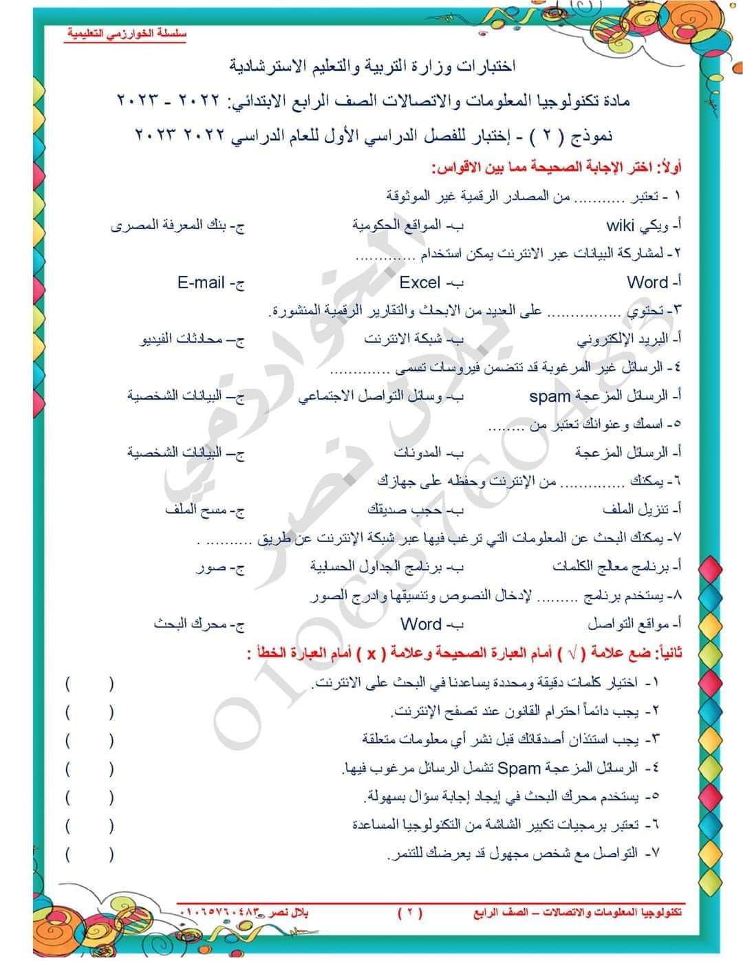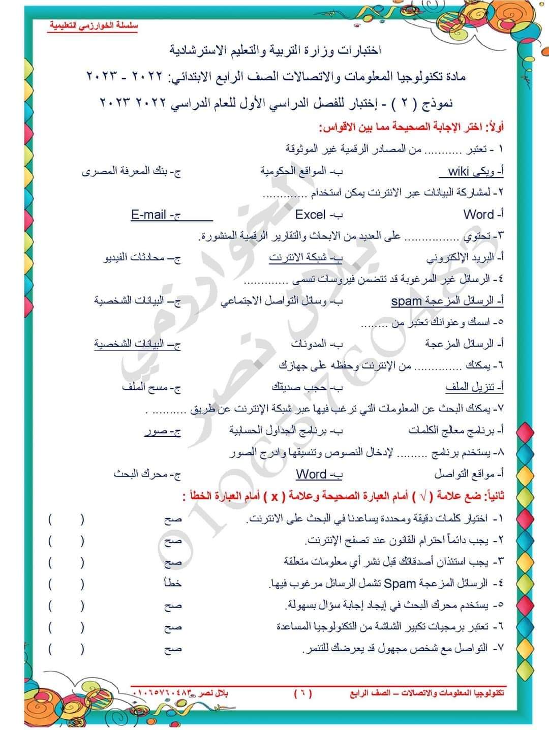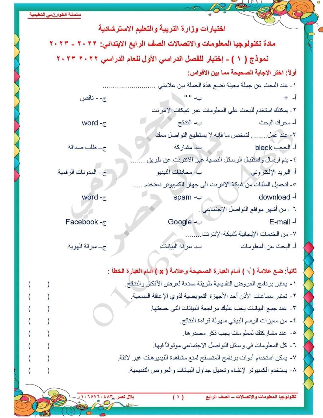 تحميل نماذج الوزارة تكنولوجيا المعلومات والاتصالات الصف الرابع الابتدائي الترم الاول 2023 بالاجابات