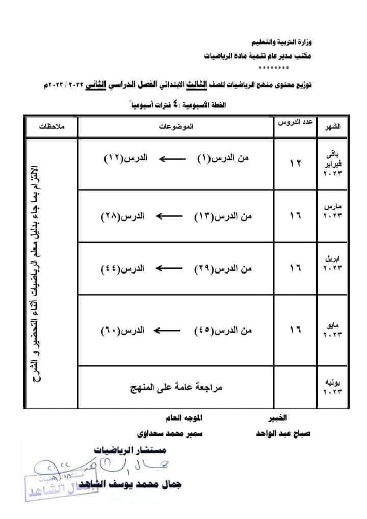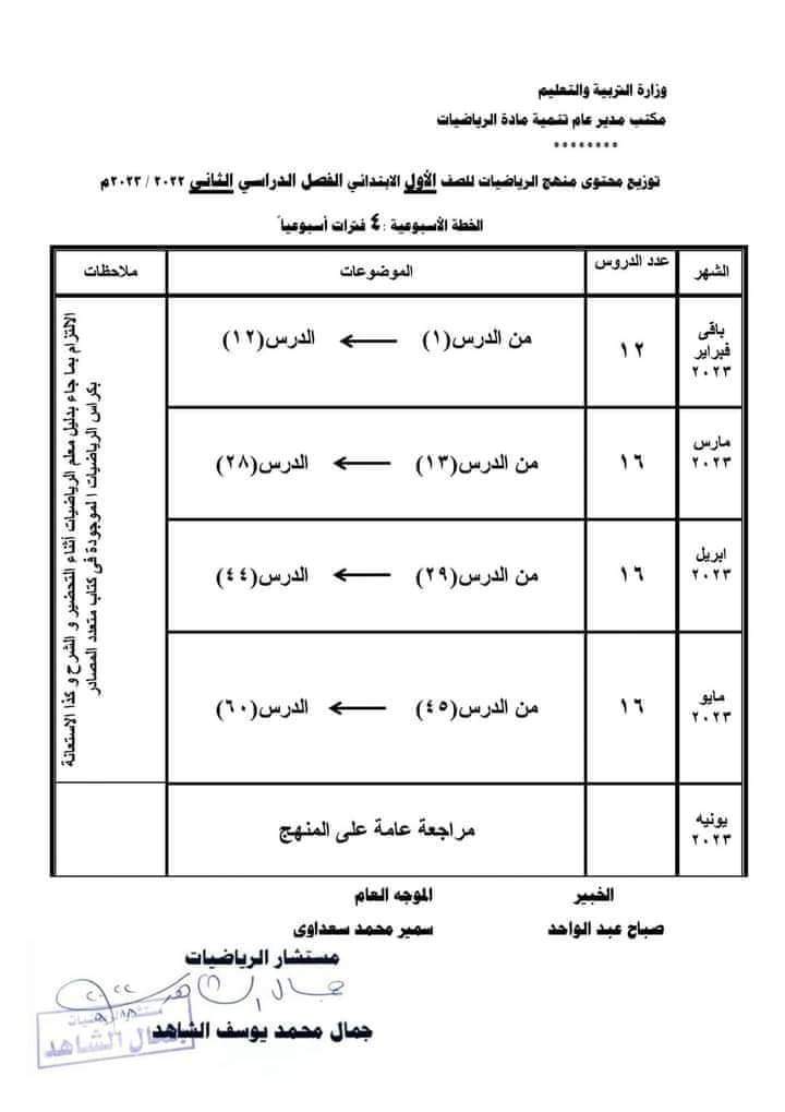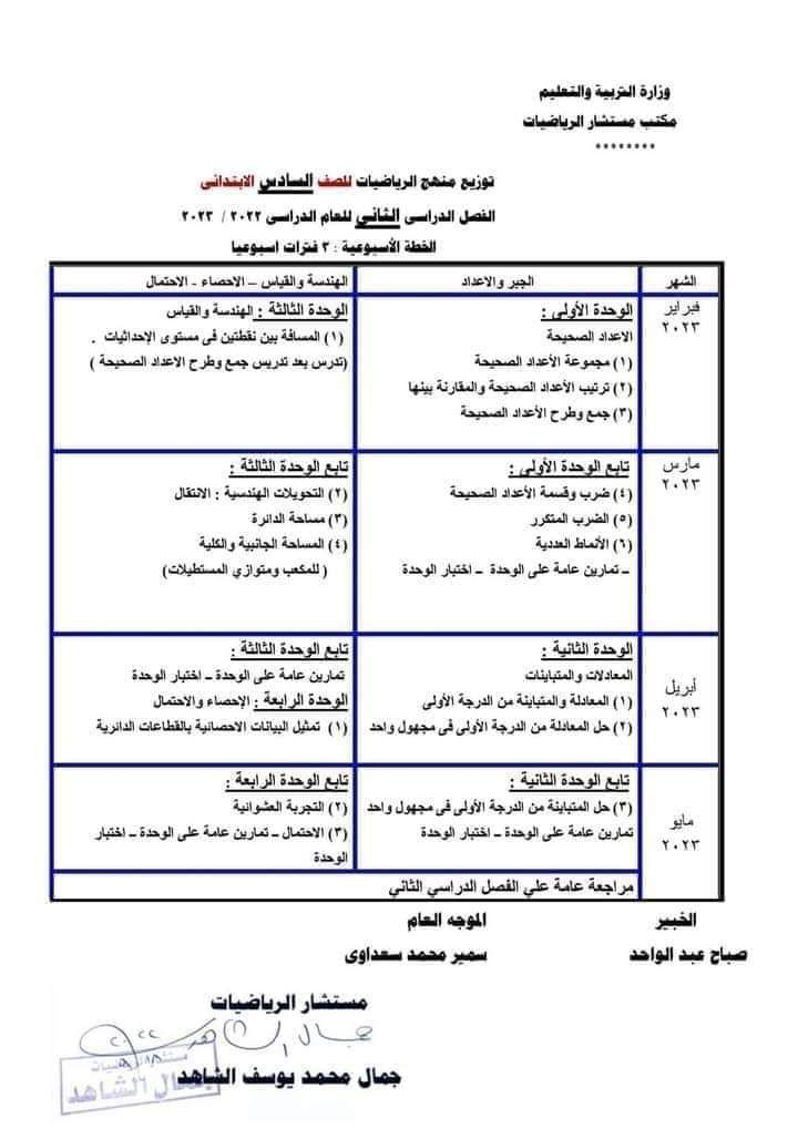 تحميل توزيع منهج الرياضيات للمرحلة الابتدائية الترم الثاني 2023