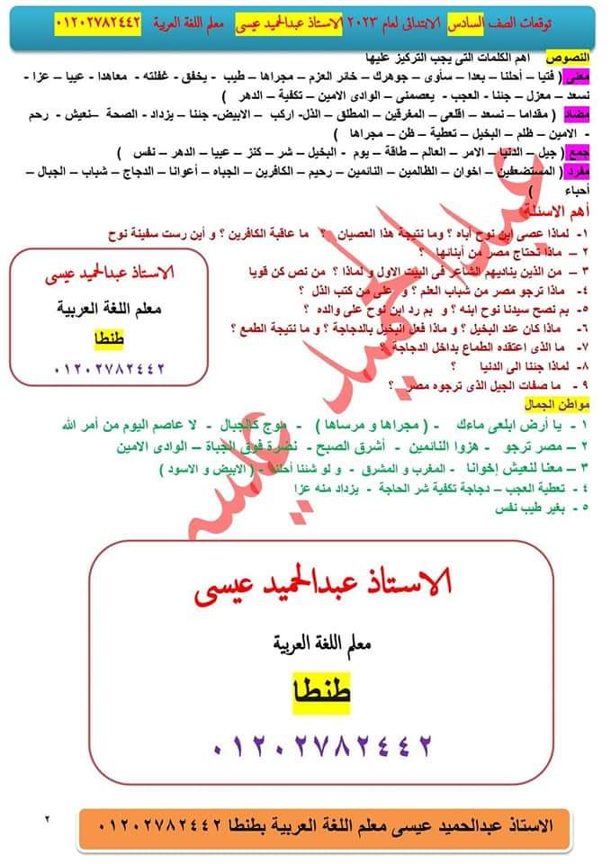 تحميل توقعات امتحان اللغة العربية كل المحافظات الصف السادس الابتدائى الترم الاول 2023