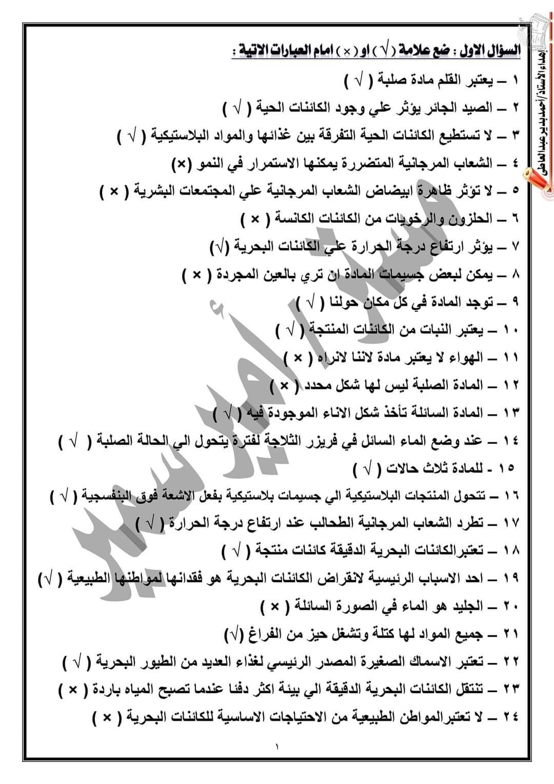 تحميل مراجعة ليلة الامتحان علوم بالاجابات خامسة ابتدائي الترم الاول 2023