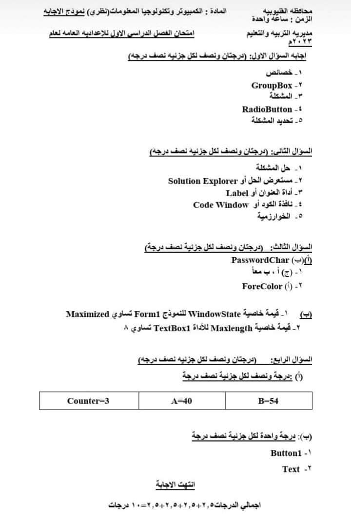 تحميل نموذج إجابة الحاسب الآلي محافظة القليوبية الصف الثالث الإعدادي