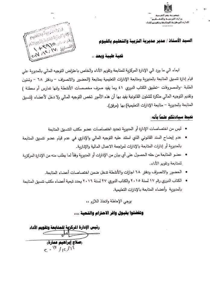 وأوضحت أنه ايماء إلى ما ورد للإدارة المركزية للمتابعة وتقويم الأداء والخاص باعتراض التوجيه المالي بالمديرية علي قيام إدارة تنسيق المتابعة بالمديرية ومتابعة الإدارات التعليمية بمتابعة الحضور والانصراف – ودفتر ٦٨ – وشئون الطلبة والمصروفات تطبيق الكتاب الدوري ٤١ وما يفيد صرف مخصصات الأنشطة وانها تمارس أم معطلة ) وتقديم التوجيه المالي مذكرة للشئون القانونية يفيد بها أن هذه الأمور تخص التوجيه المالي ولا دخل لأعضاء (تنسيق المتابعة بالمديرية – متابعة الإدارات التعليمية بها.