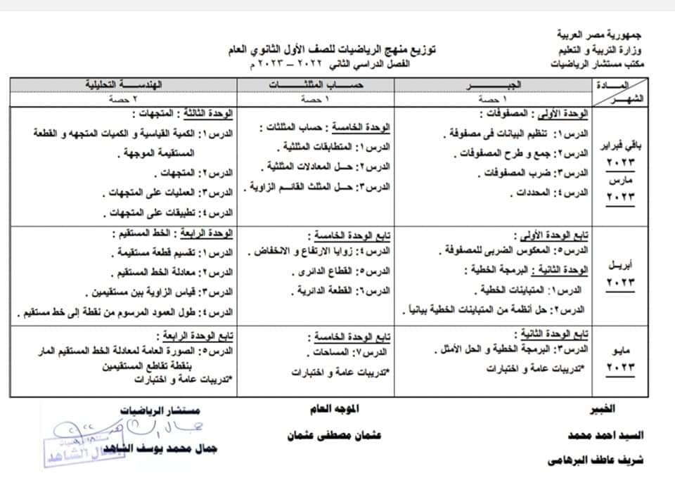 تحميل توزيع منهج الرياضيات للصفين الاول والثاني الثانوي الترم الثاني 2023