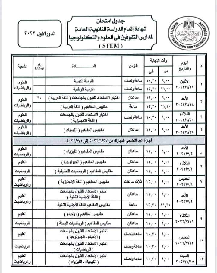 جدول امتحانات الثانوية العامة لمدارس المتفوقين stem 2023 الدور الاول