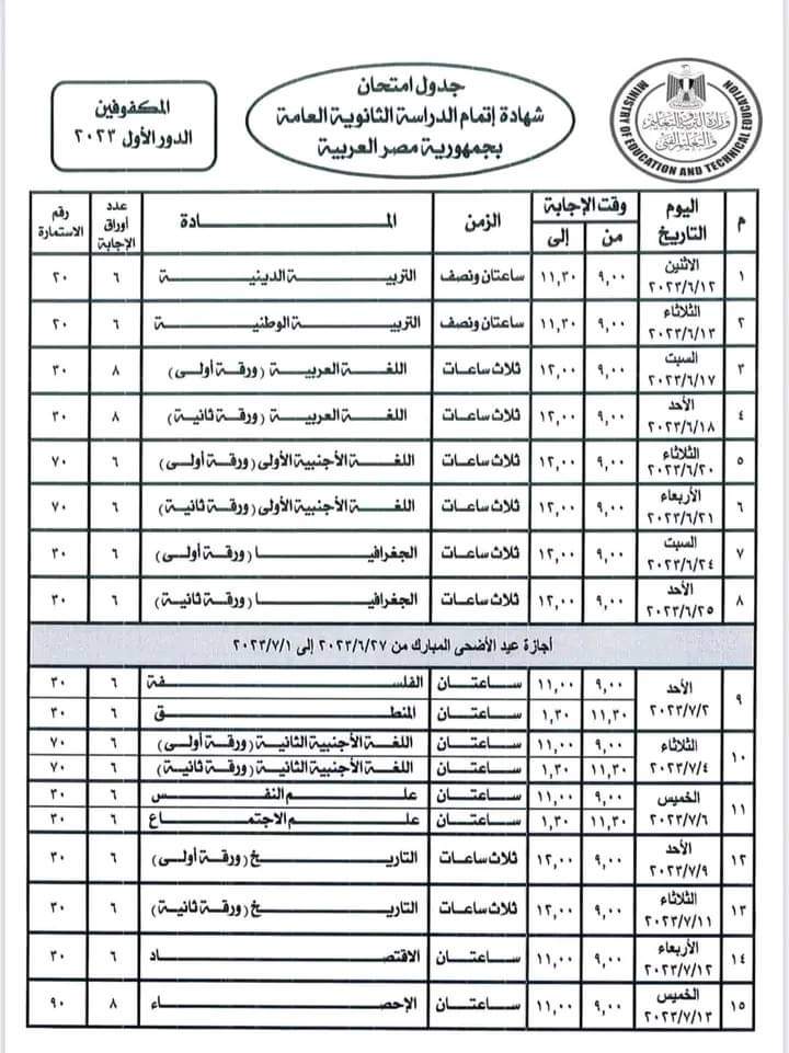 رسميًّا اعتماد جداول امتحانات الثانوية العامة 2023 الدور الاول
