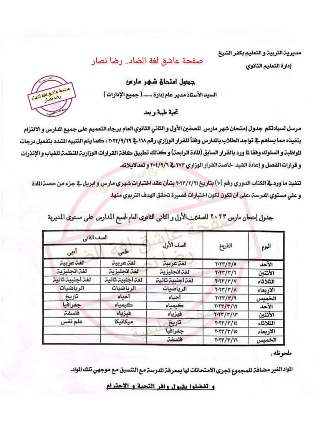 تحميل جدول امتحانات فبراير الصفين الاول والثاني الثانوي محافظة كفر الشيخ 2023
