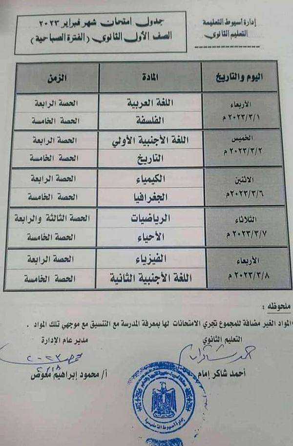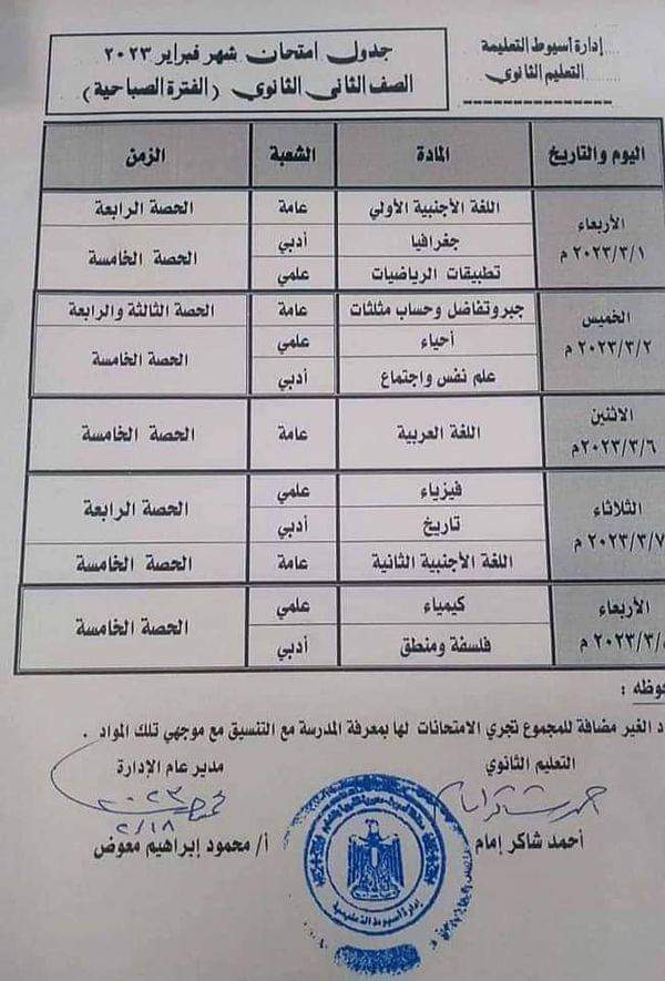 جدول امتحانات الصف الاول والثاني الثانوي محافظة اسيوط شهر فبراير 2023