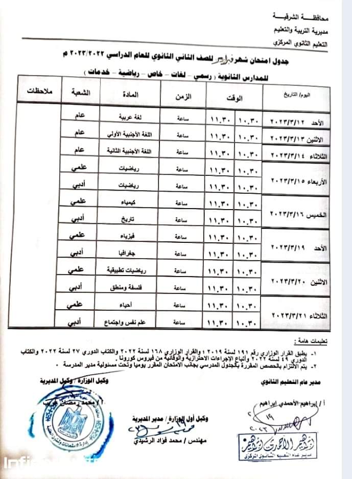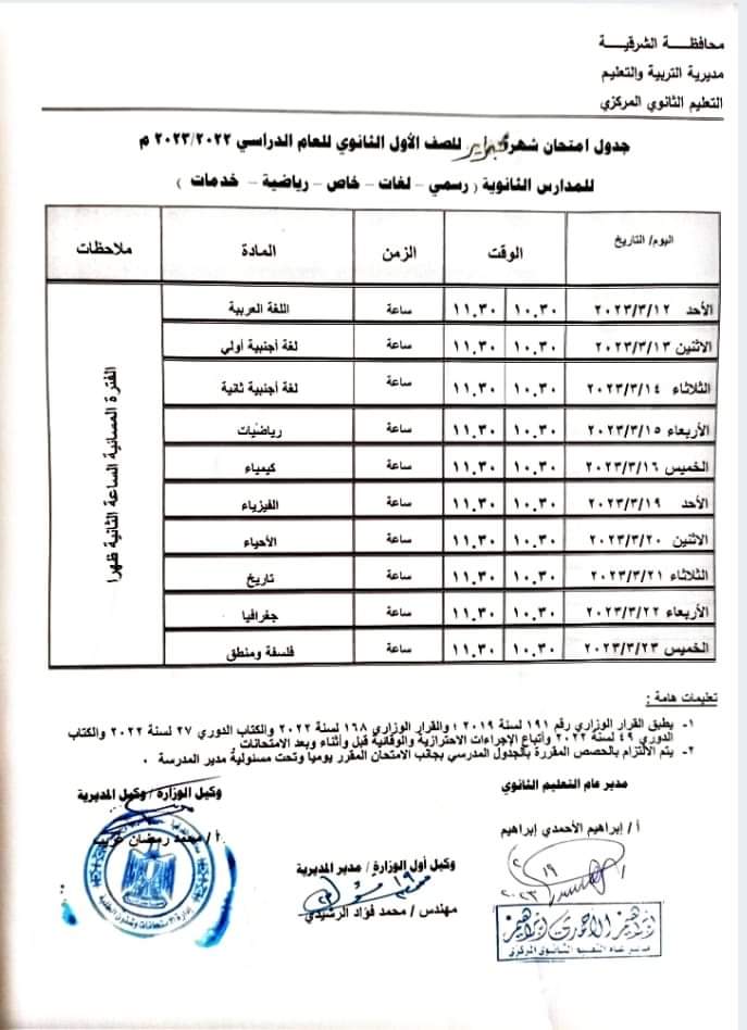جدول امتحانات الصف الاول والثاني الثانوي محافظة الشرقية شهر فبراير 2023