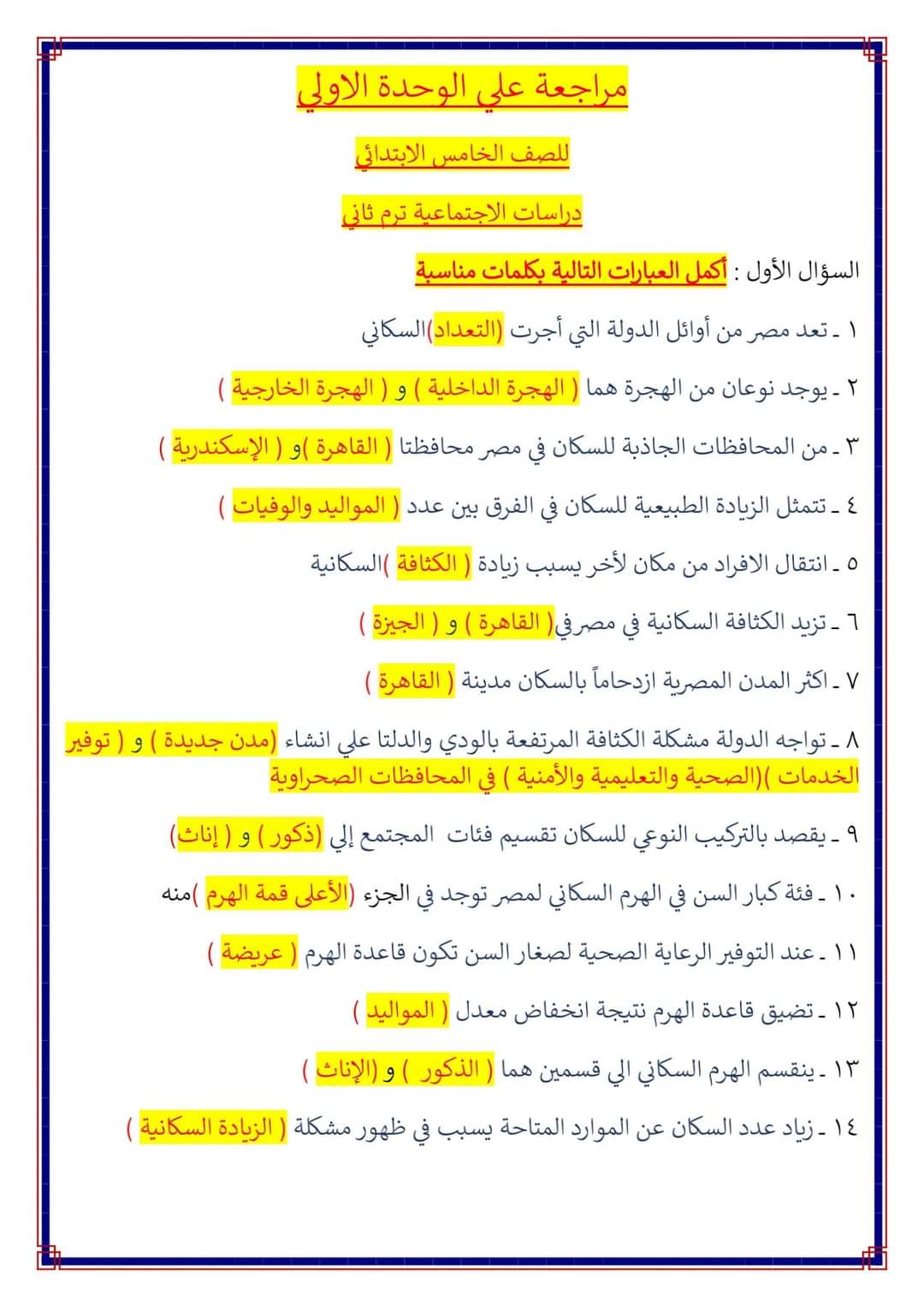 حل تدريبات على الوحدة الأولى دراسات الصف الخامس الابتدائي الترم الثاني 2023