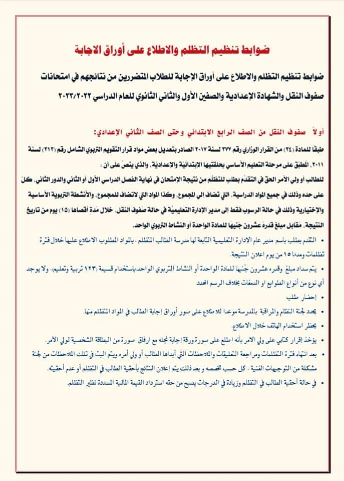 تحميل مستندات و ضوابط تنظيم التظلم والاطلاع على أوراق الإجابة 2023
