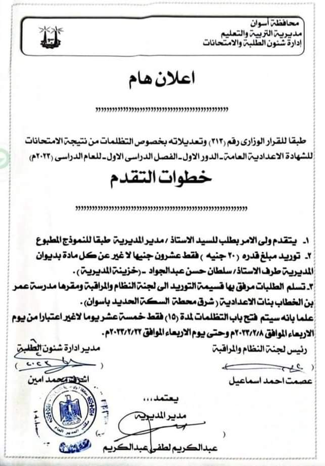 قواعد التظلم من نتيجة الشهادة الإعدادية الفصل الدراسي الأول 2023