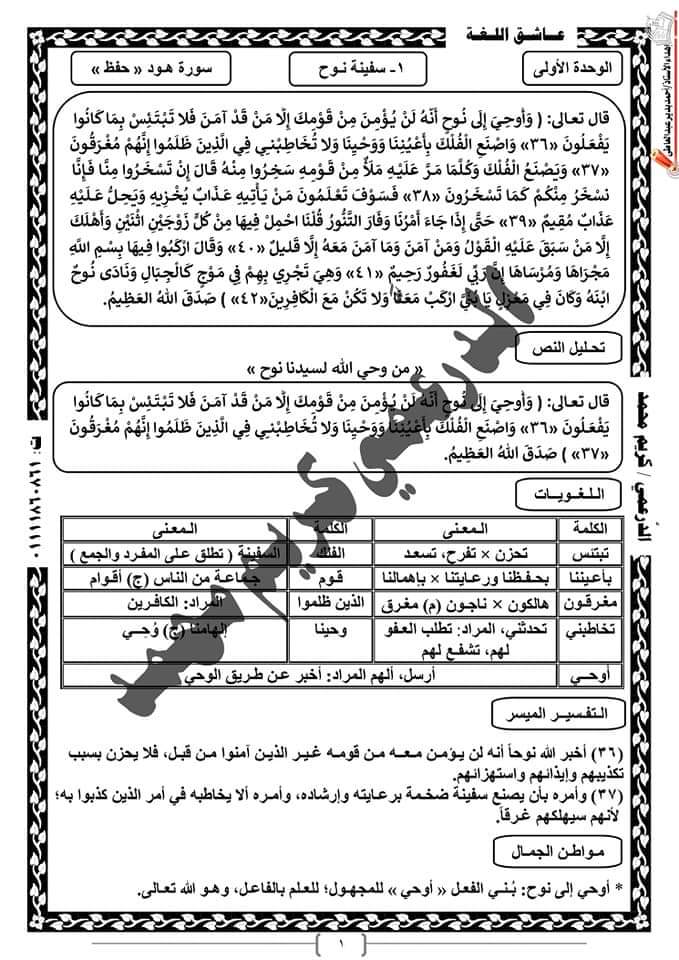 مذكرة اللغة العربية للصف الثاني الإعدادي ترم ثان