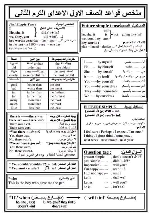 تحميل ملخص جرامر الصف الاول الاعدادي الترم الثاني 2023 في ورقة واحدة