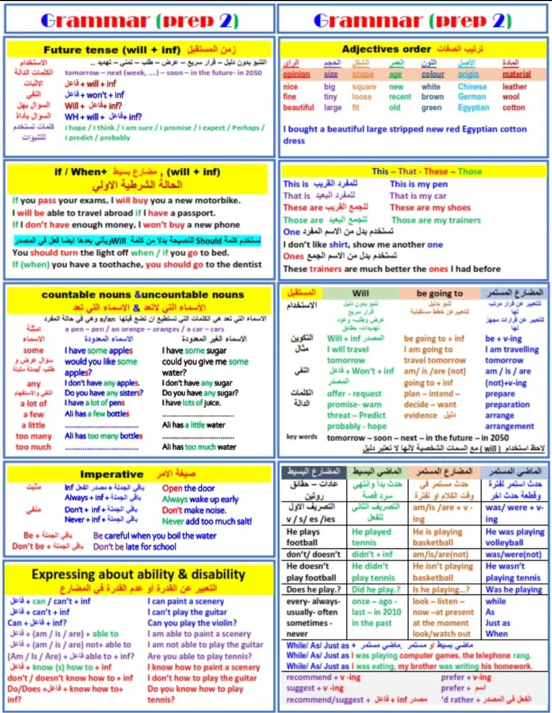 تحميل ملخص جرامر الصف الثاني الاعدادي الترم الثاني 2023 في ورقة واحدة