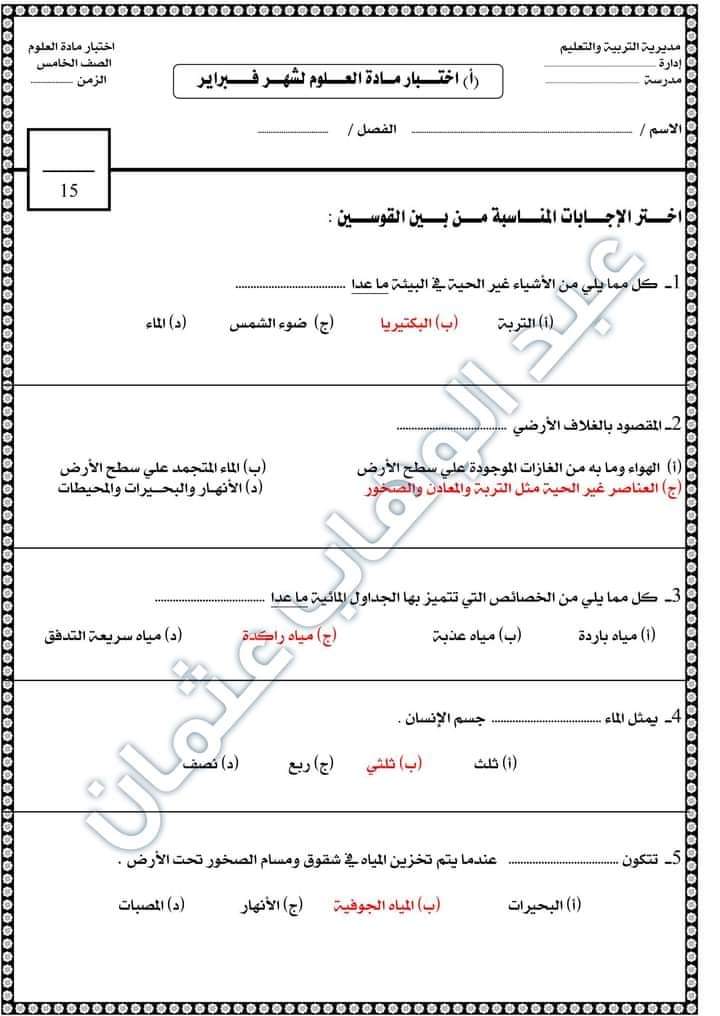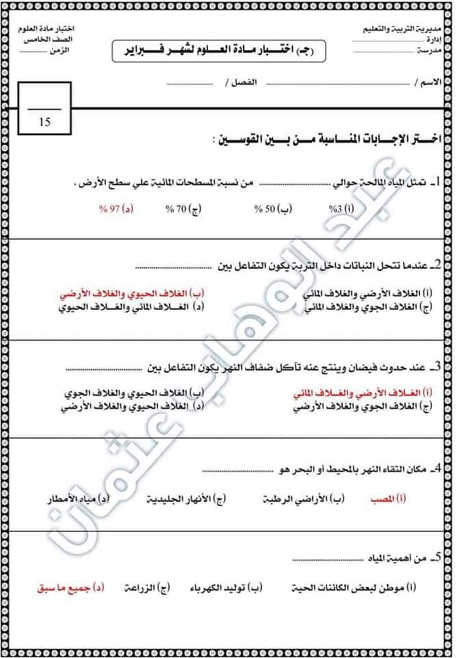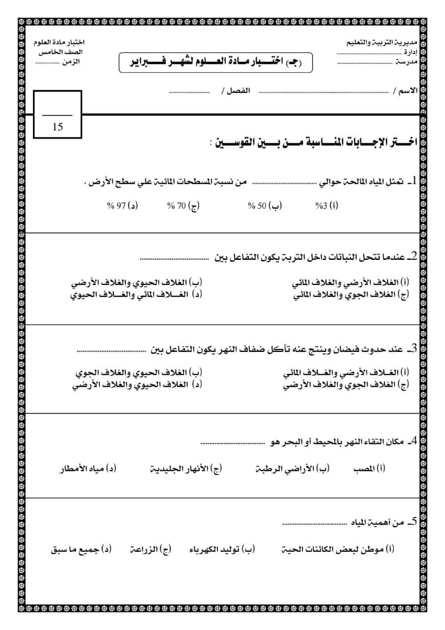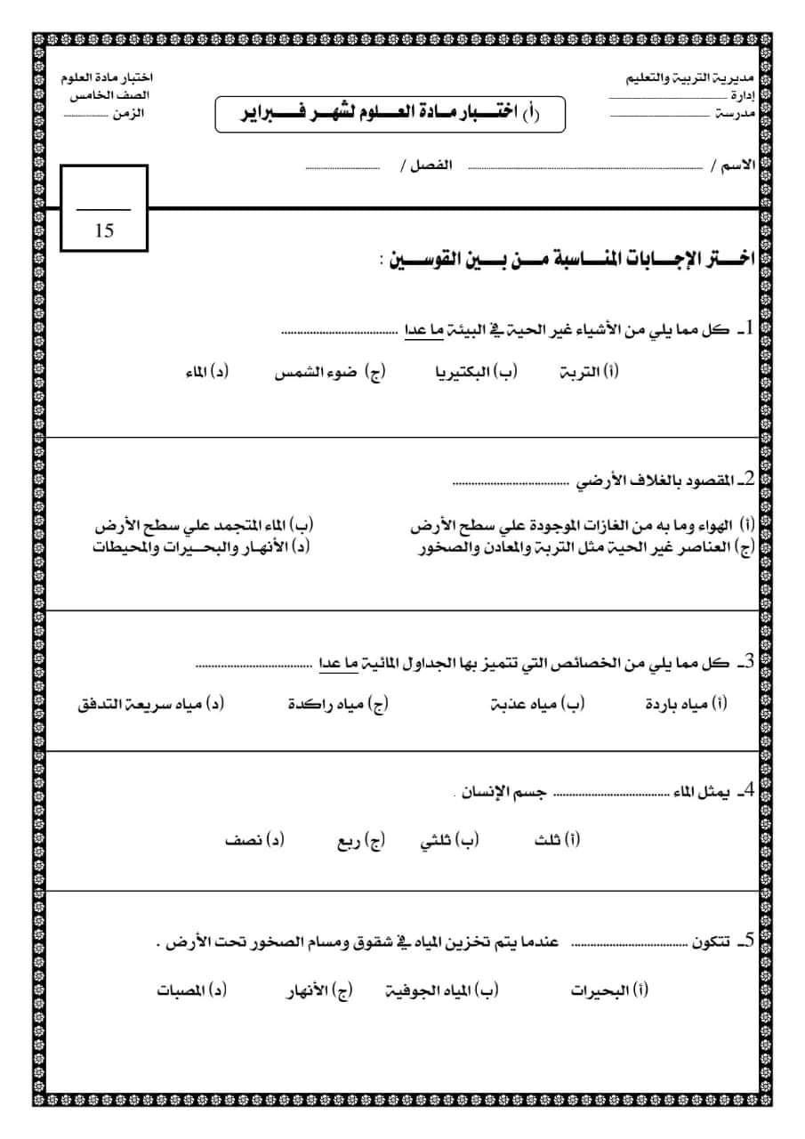 تحميل نماذج اختبارات علوم الصف الخامس الابتدائي مقرر فبراير 2023