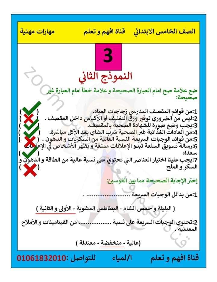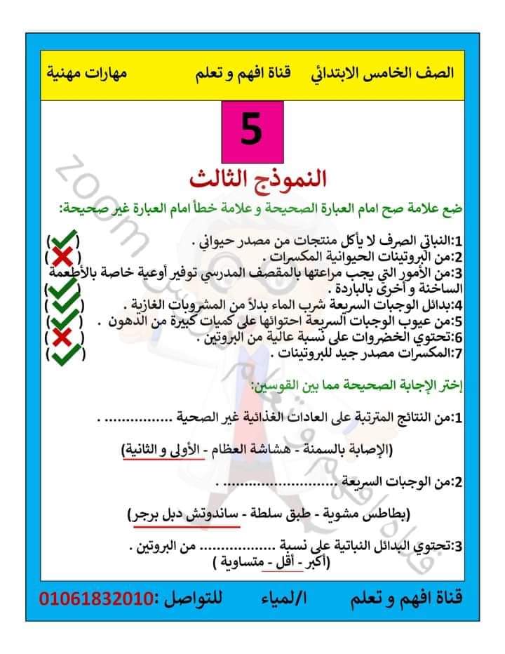نماذج امتحانات مهارات مهنية الصف الخامس الابتدائي منهج فبراير ومارس 2023
