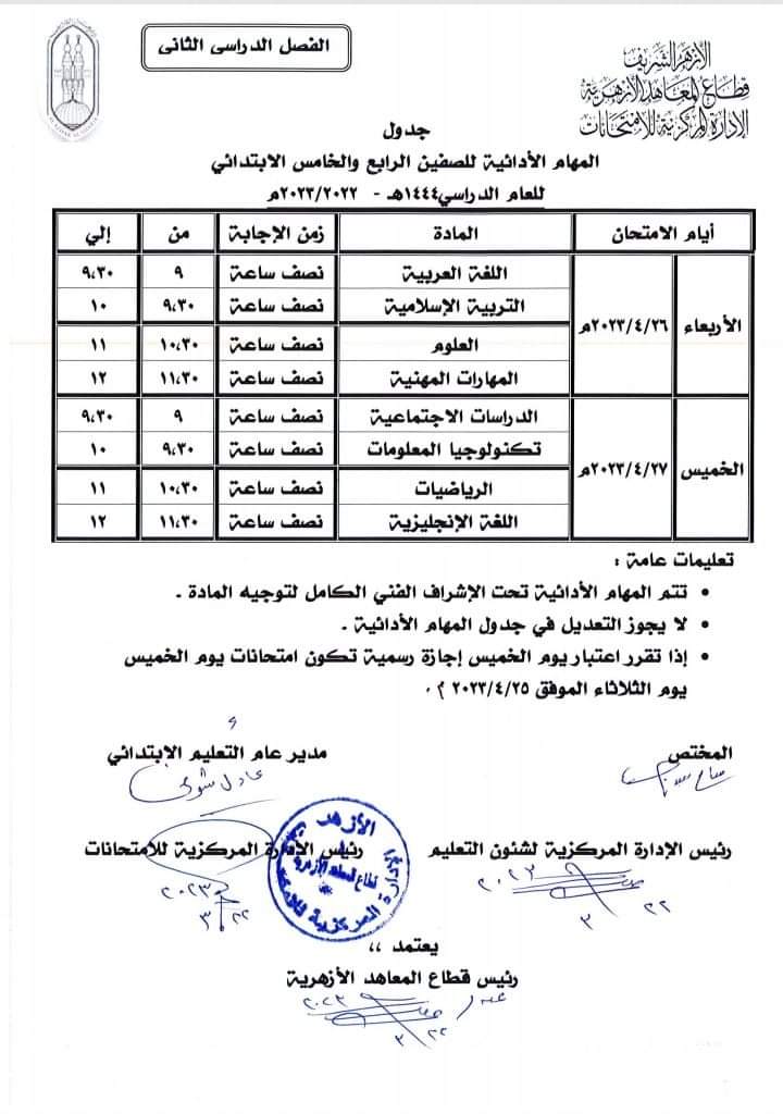 تحميل جدول اختبارات المهام الادائية للصفين الرابع والخامس الابتدائي الأزهر الشريف الترم الثاني 2023
