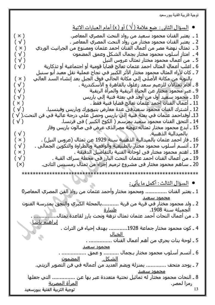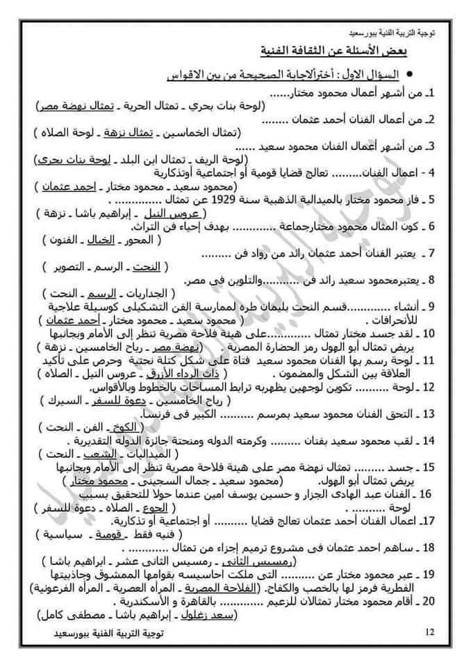 تحميل الاسئلة المتوقعة تربية فنية الصف الثالث الاعدادي الترم الثاني 2023 بالاجابات