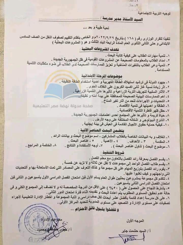 رسميًا ” توجيه عام التربية الإجتماعية ” ينشر المشروعات البحثية المطلوبة من فرق النقل لكل المراحل ترم ثاني و شروط البحث المقبول و تسلم قبل منتصف إبريل 2023
