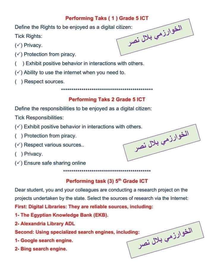 الصف الخامس مهام أدائية ICT مع نموذج أجابة