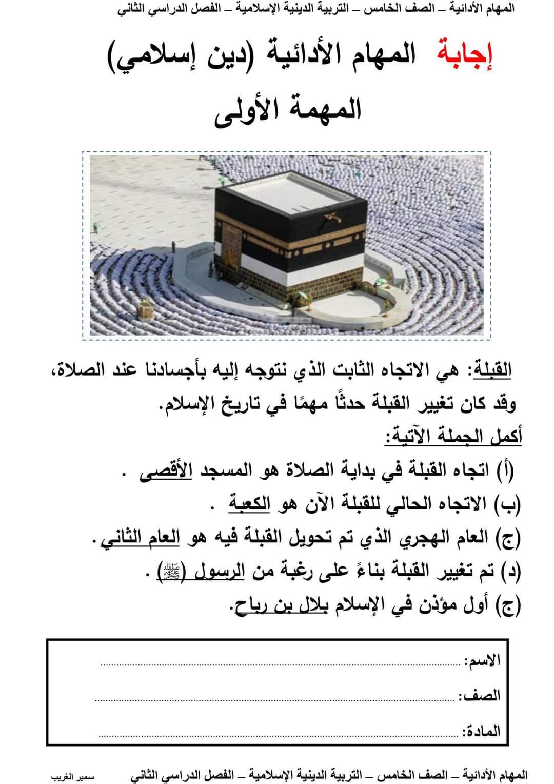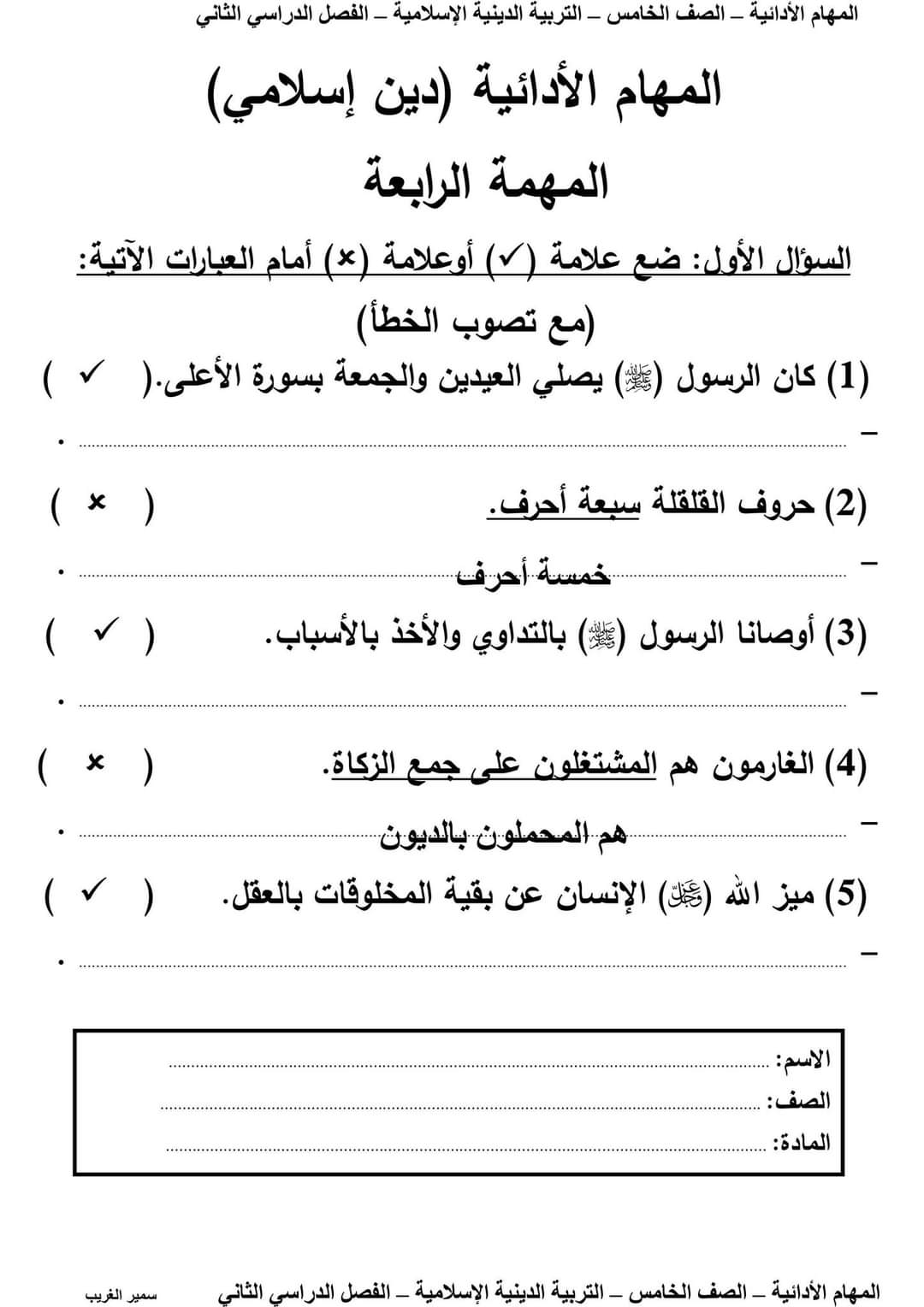 المهام الادائية دين اسلامي للصف الخامس الابتدائي الترم الثاني 2023