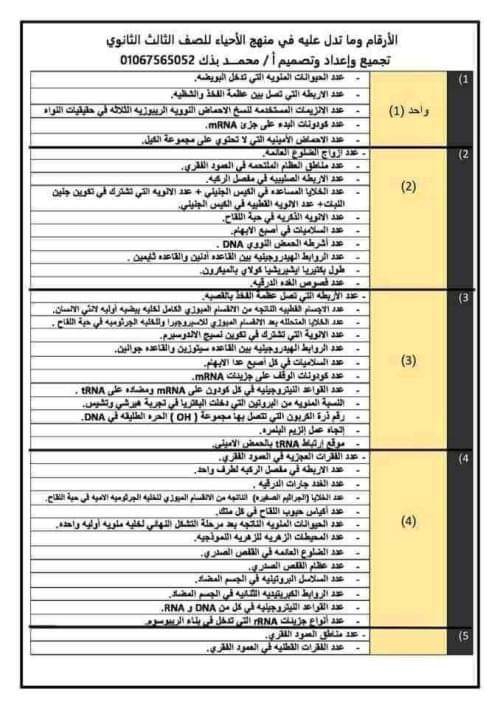 اهم الأرقام في مادة الأحياء للصف الثالث الثانوي نظام حديث