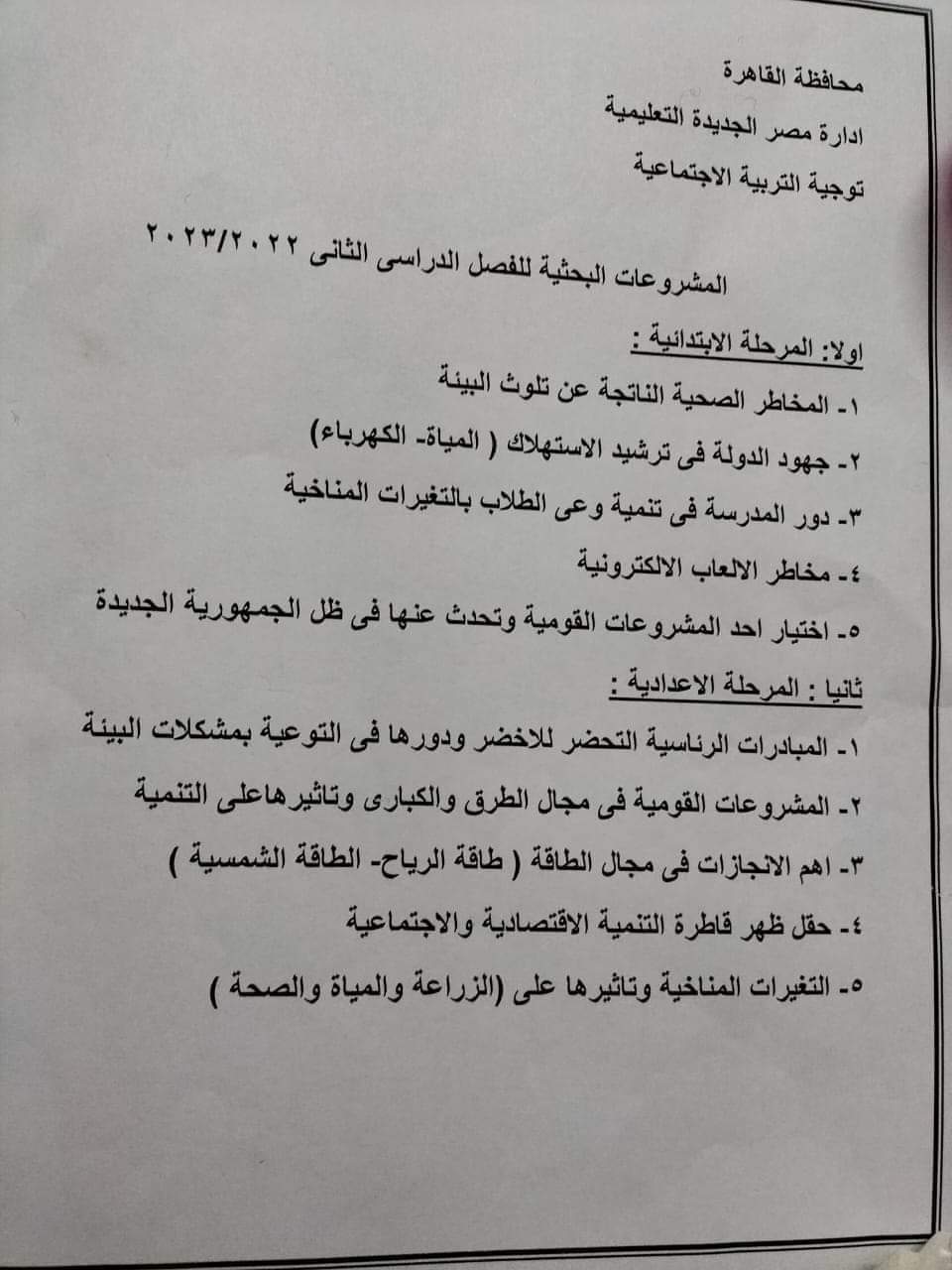 مديرية تعليم القاهرة تنشر المشروعات البحثية المطلوبة من طلاب نقل ابتدائي و إعدادي و ثانوي ترم ثاني 2023