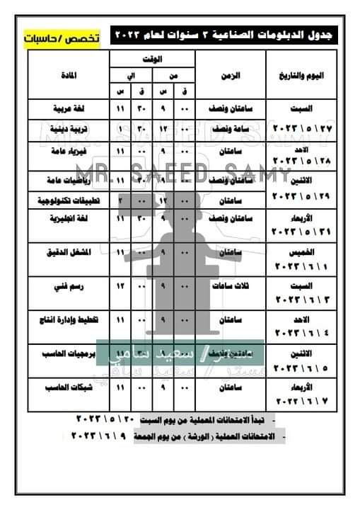 تحميل جدول الدبلومات الصناعية 3 سنوات الدور الاول 2023 تخصص حاسبات