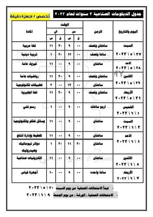 تحميل جدول الدبلومات الصناعية 3 سنوات الدور الاول 2023 تخصص اجهزة دقيقة