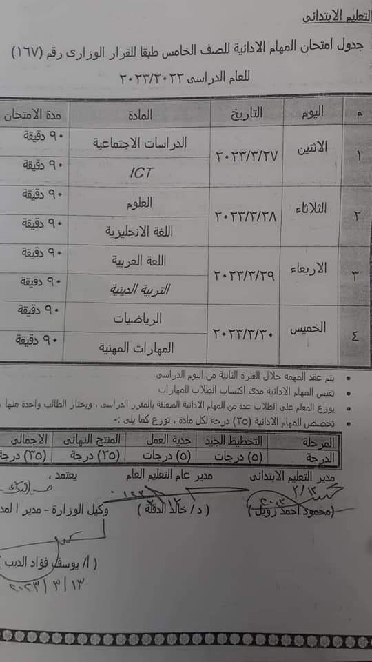 جدول المهام الادائيه للصف الخامس الابتدائي الترم الثاني 2023
