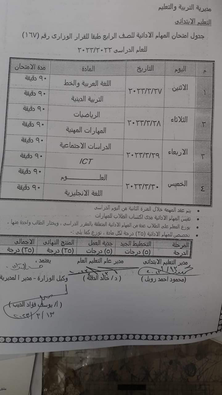 جدول المهام الادائيه للصف الرابع الابتدائي الترم الثاني 2023