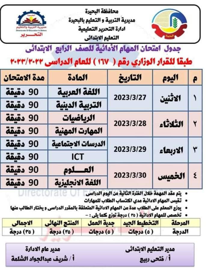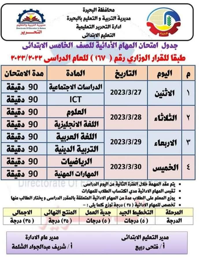 جدول المهام الادائيه للصف الرابع والخامس الابتدائي محافظة البحيرة الترم الثاني 2023