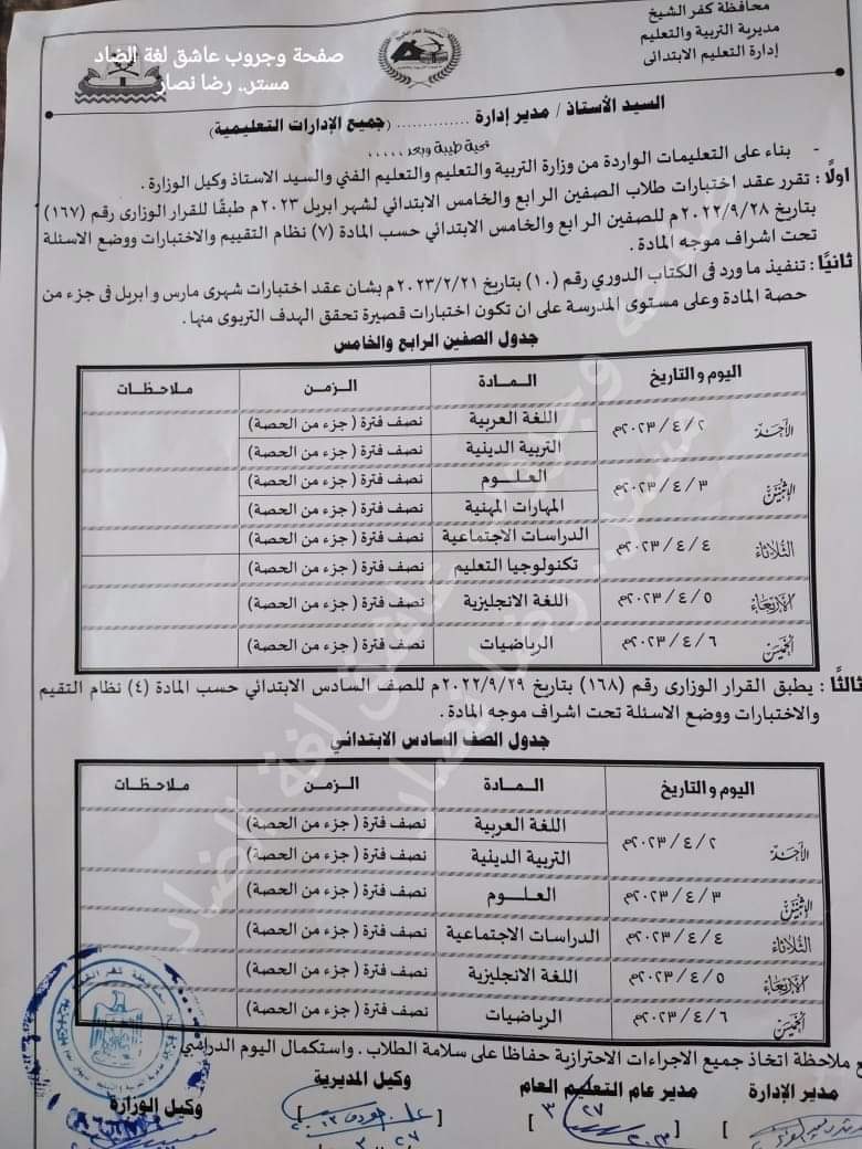 تحميل جدول امتحانات شهر ابريل للصفين الرابع والخامس الابتدائي محافظة كفر الشيخ الترم الثاني