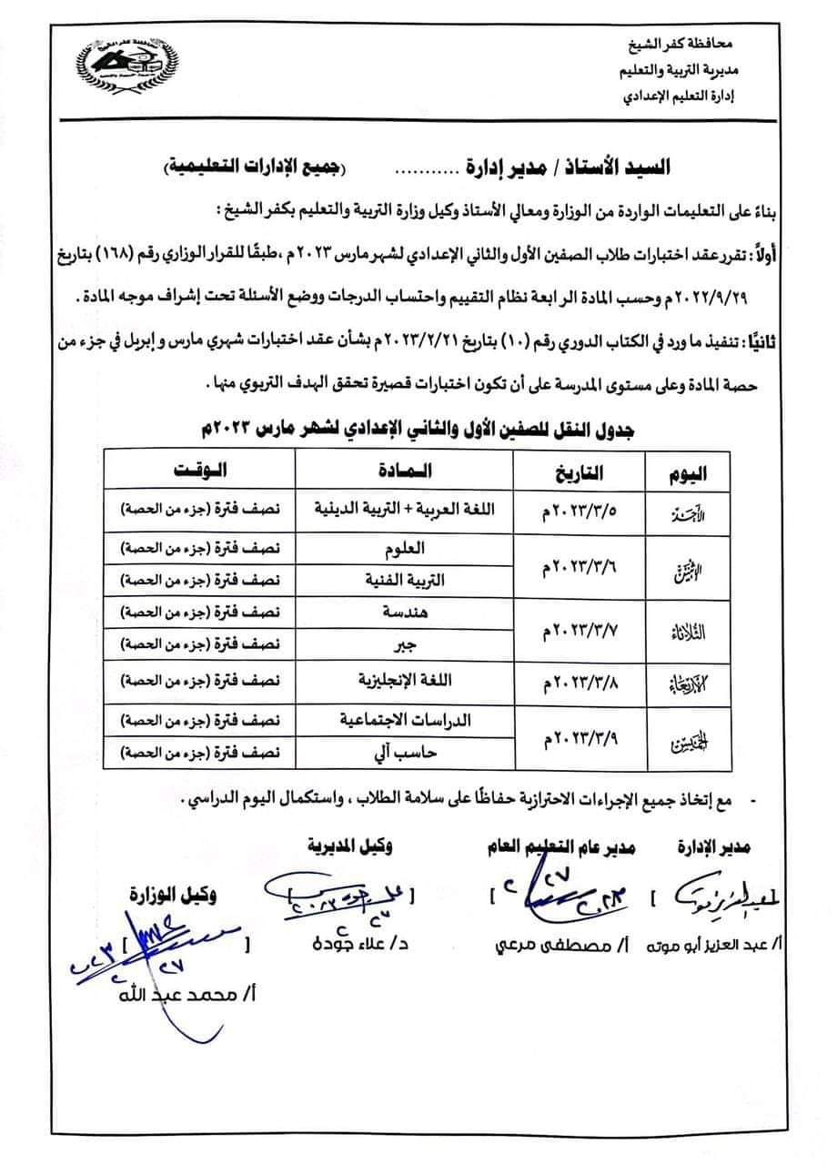 تحميل جدول امتحانات شهر مارس 2023 محافظة كفرالشيخ للصفين الاول والثاني الاعدادي