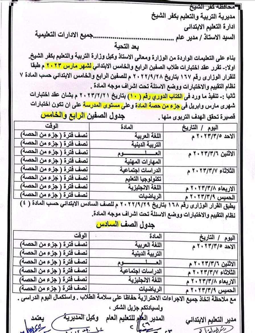 تحميل جدول امتحانات شهر مارس 2023 محافظة كفرالشيخ للمرحلة الابتدائية والإعدادية