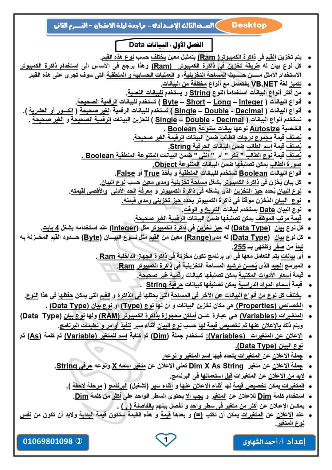 مراجعة ليلة الامتحان (كمبيوتر وتكنولوجيا المعلومات) الثالث الإعدادي الترم الثاني في ثماني أوراق فقط: