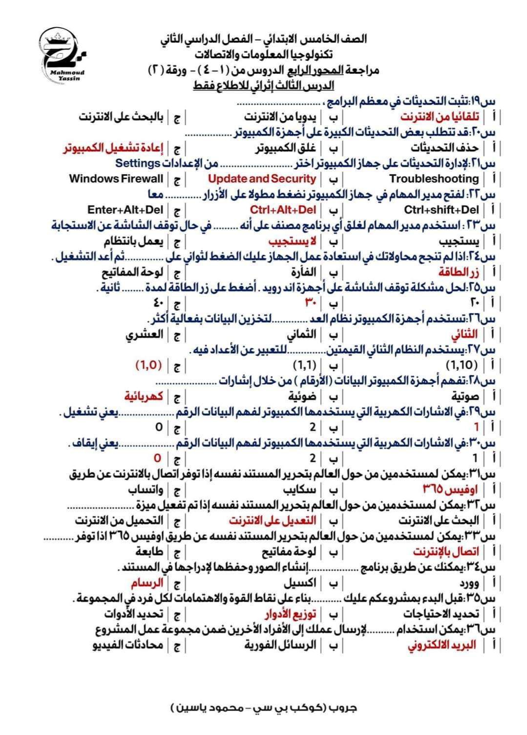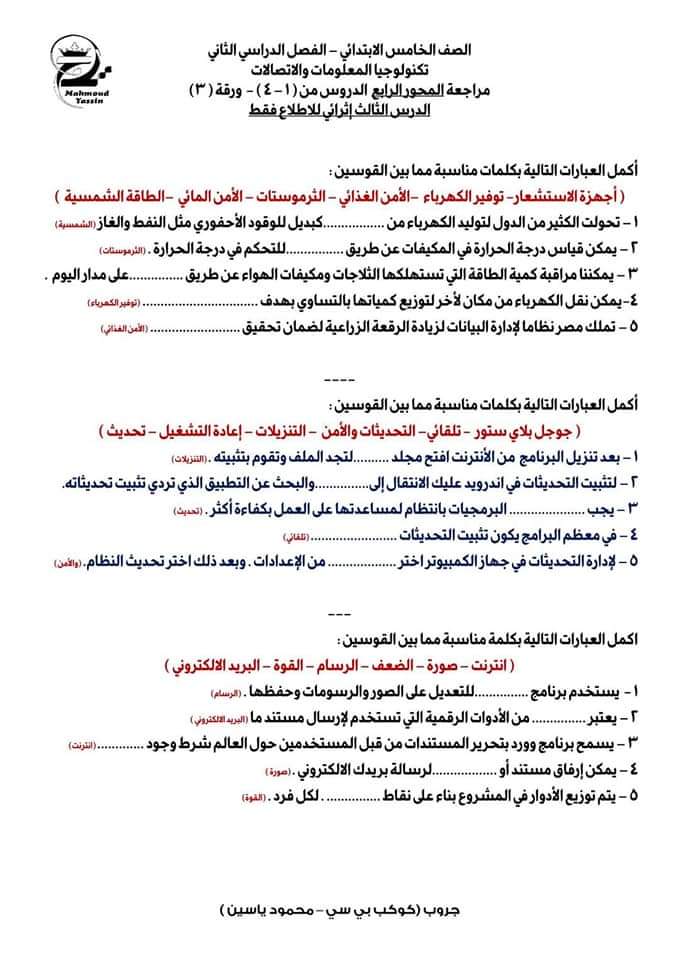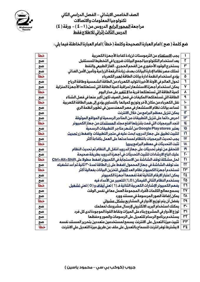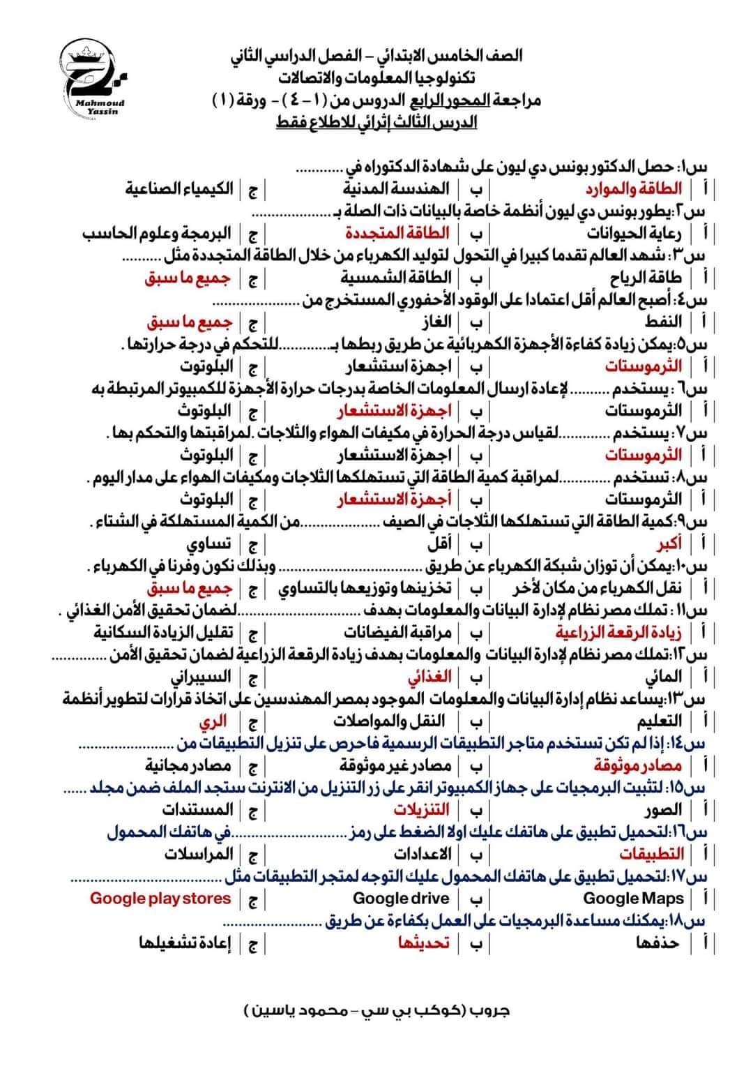 تحميل مراجعة تكنولوجيا المعلومات والاتصالات خامسة ابتدائي الترم الثاني 2023
