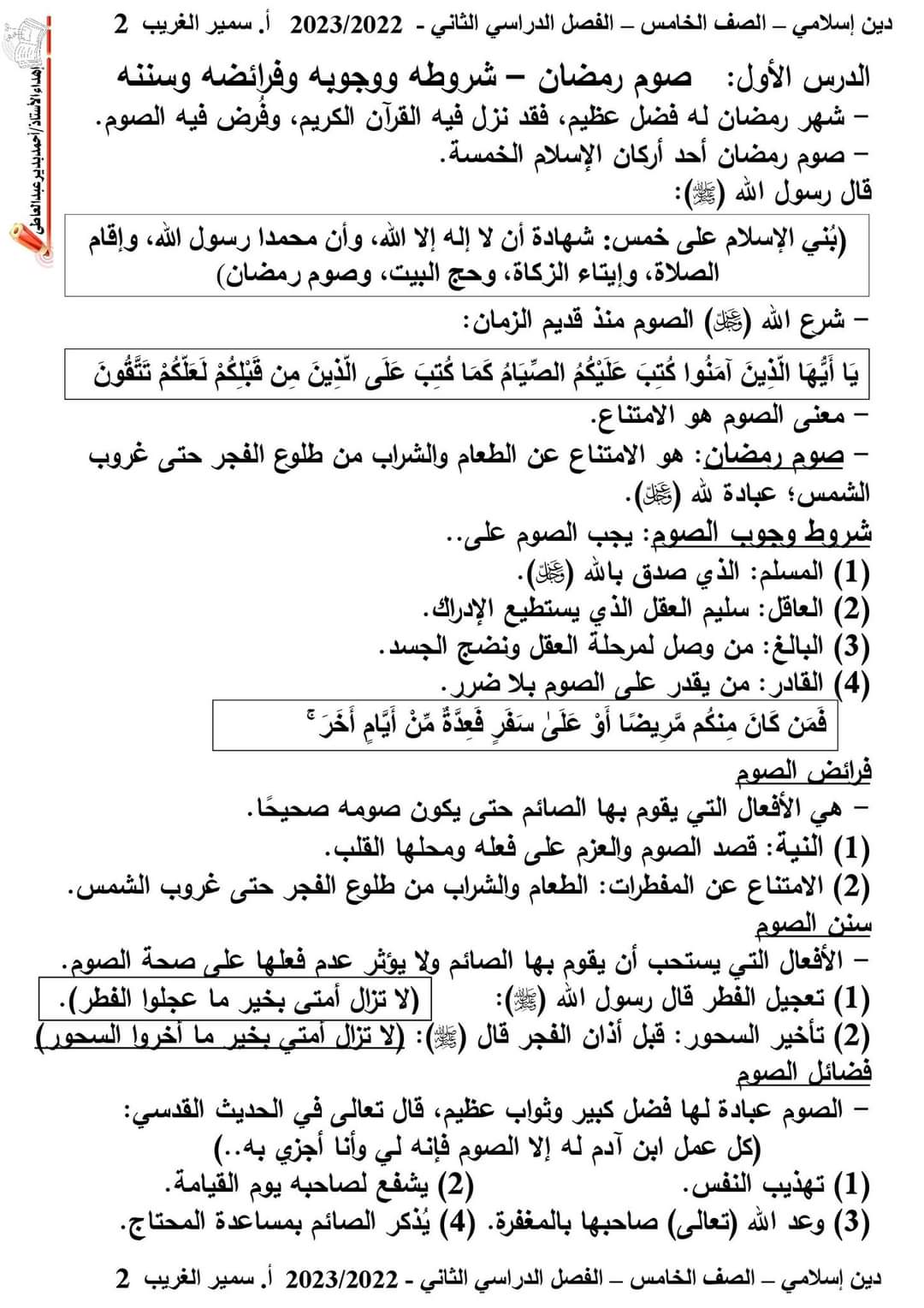 تحميل مراجعة مقرر مارس تربية اسلامية الصف الخامس الابتدائي 2023 بالاجابات