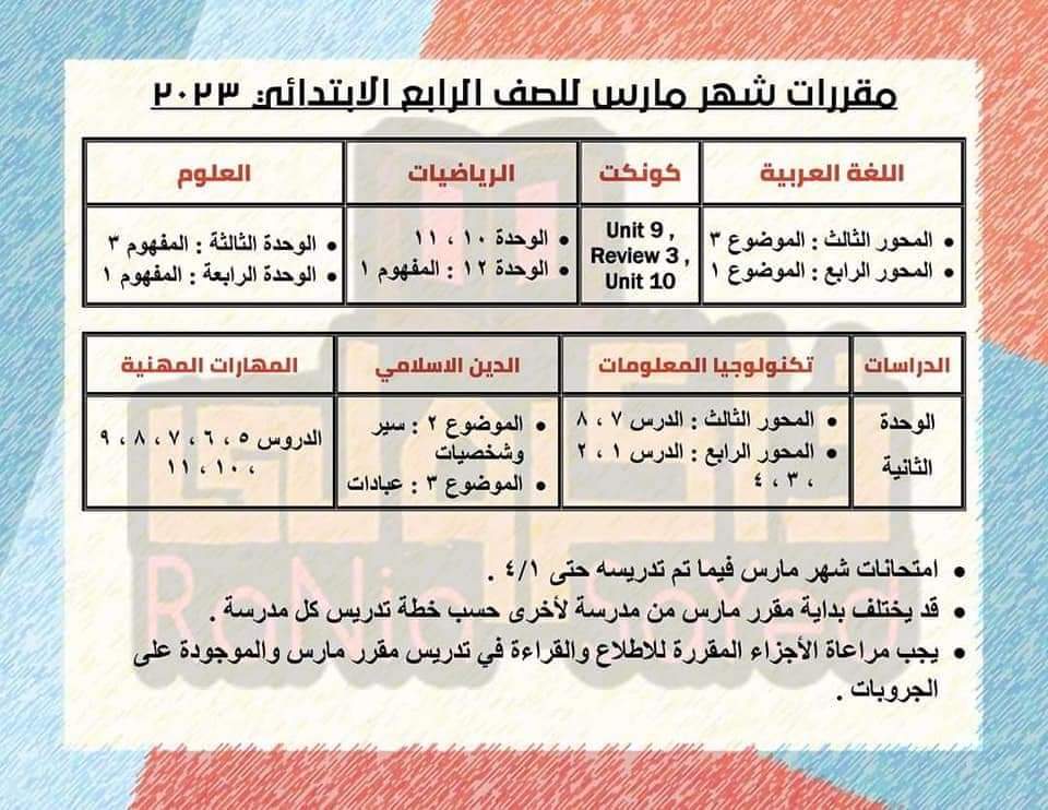تحميل مقررات شهر مارس للصف الرابع الابتدائي 2023