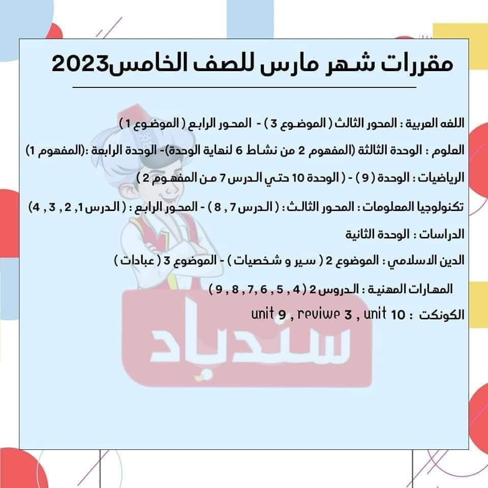 مقرر شهر مارس كل مواد الصف الخامس الابتدائي الترم الثاني 2023