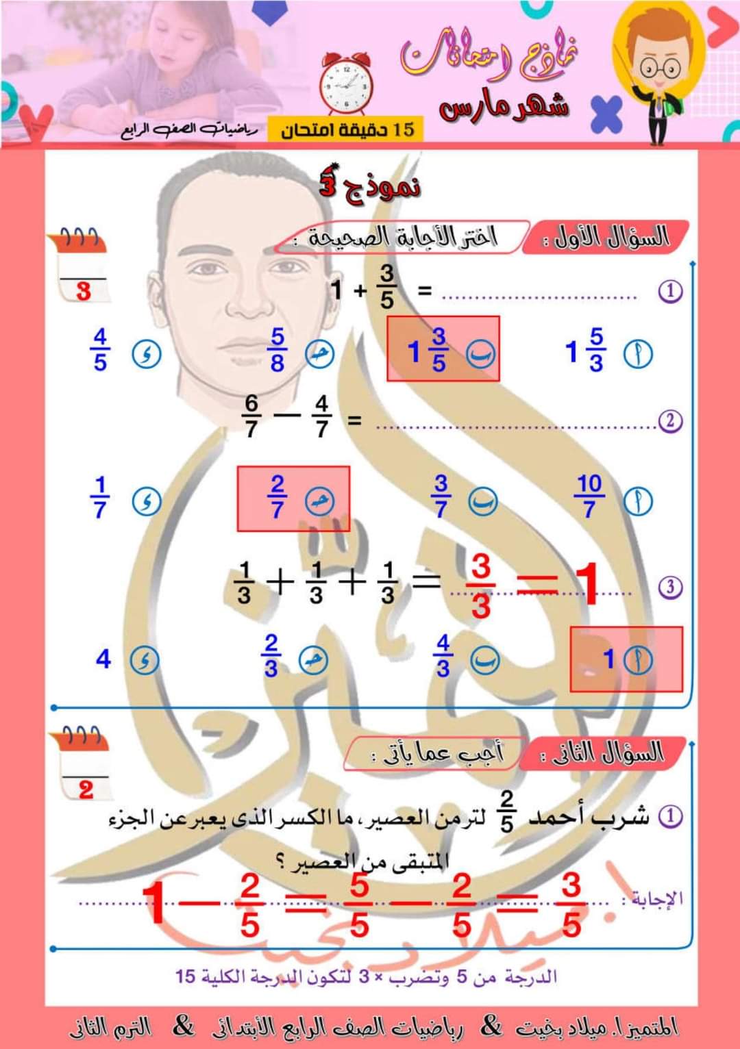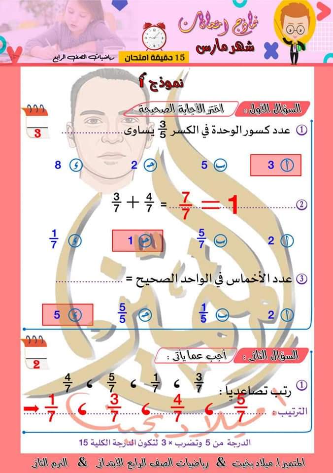 تحميل نماذج اختبارات رياضيات الصف الرابع الابتدائي مقرر مارس بالحل
